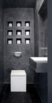 Mag vor allem eins sehr gerne: Nachdenken! Und zwar über wichtigere Themen als Toilettenpapier. Deshalb spielt die Rolle in seinem Bad auch eine etwas untergeordnete Rolle. Was nicht heißt, die Unterbringung sei nicht durchdacht. Im Gegenteil, man sieht: hier war einer mit Köpfchen am Werk. Aber trotzdem, an erster Stelle steht die Lektüre. Darunter gibt es ein diskretes Fach für die noch unliebsameren Dinge dieser Welt. Aber eben: stylish, praktisch, cool.