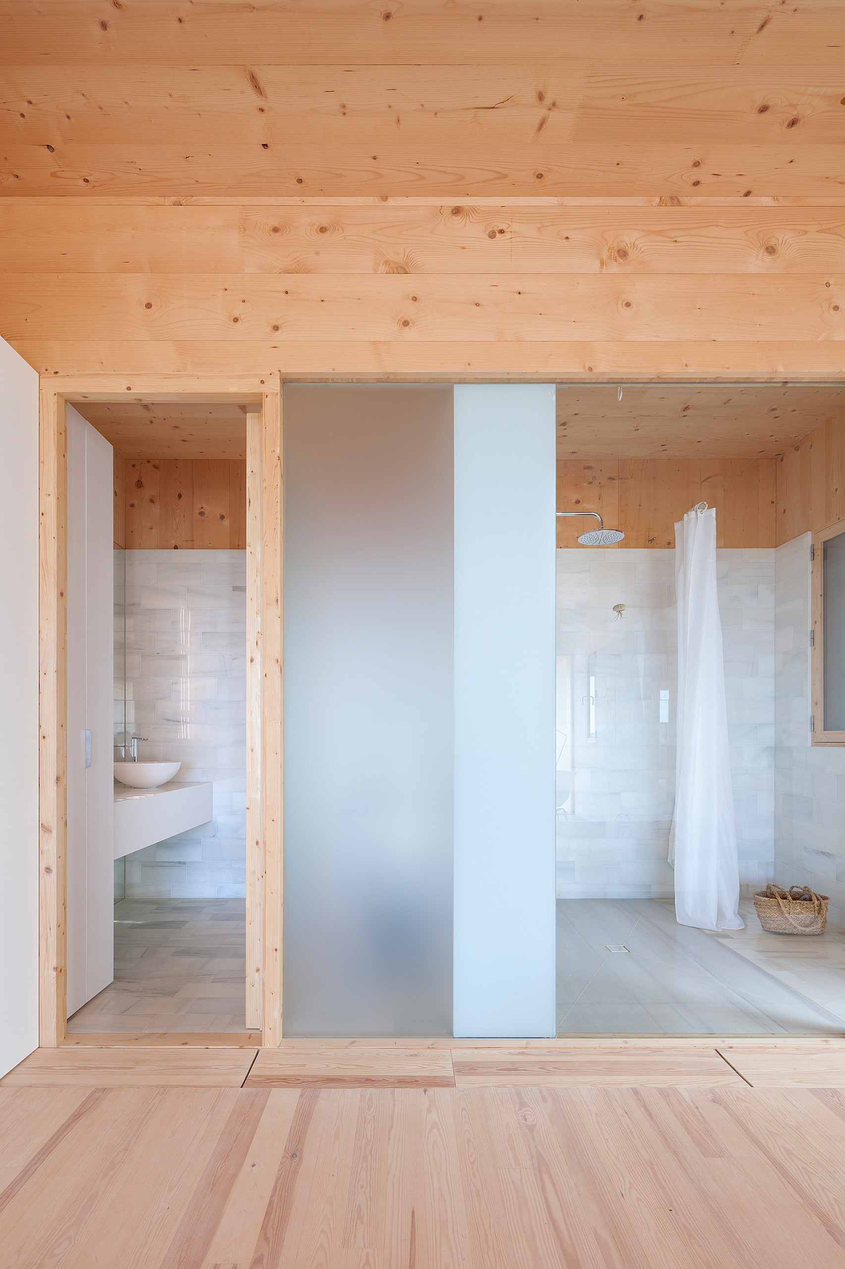 Zu den Materialien im Badezimmer en Suite gehören: Brettsperrholz aus Tanne (Wände, Vertäfelung und Finish), 30 mal 15 Zentimeter große weiße Macael Marmorfliesen für Boden und Wände sowie maßgefertigte Stücke aus Corian.