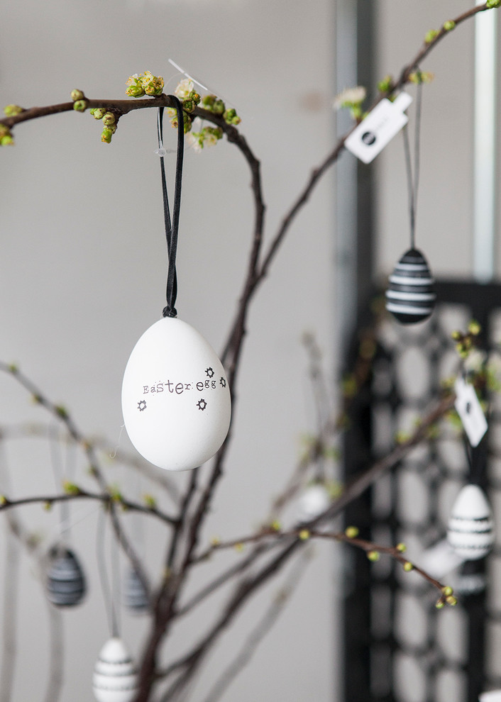 4. Luftnummer: Ostereier im Scandi Chic. Schon Eier ausgepustet? Auf dem österlich gedeckten Tisch dürfen auch ein paar Zweige, an denen ausgepustete und handbemalte Eier baumeln, nicht fehlen. Dafür eignen sich gelb blühende Forsythien genauso gut wie zarte Kirsch- oder Mandelblüten. Skandinavisch schlicht bleibt die Osterdeko, wenn Sie die weißen Eier mit schwarz-weißen Mustern und Schriftzügen verzieren. Oder Sie greifen zu Naturfarben und verschönern die gefärbten Eier mit feinen Linien.