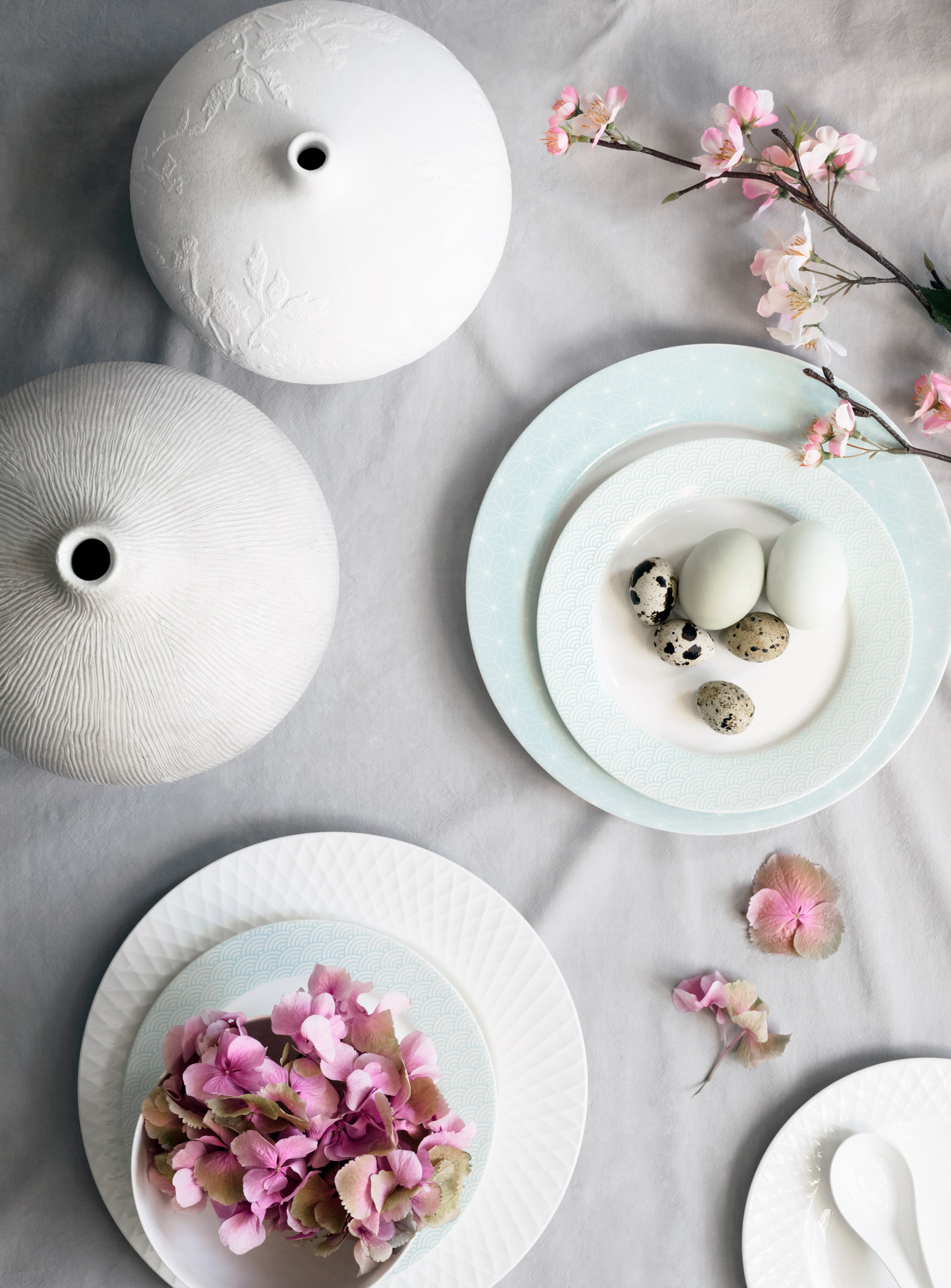 7. Hortensien und Wachteleier als österlicher Tischschmuck. Schlichtweg eine Pracht. Hortensien verbreiten auch leicht verwelkt noch ihren ganz besonderen Charme. Hier ergänzen Wachteleier, Kirschblüten und feinstes China-Porzellan das Ensemble zu einer festlichen Osterdeko.