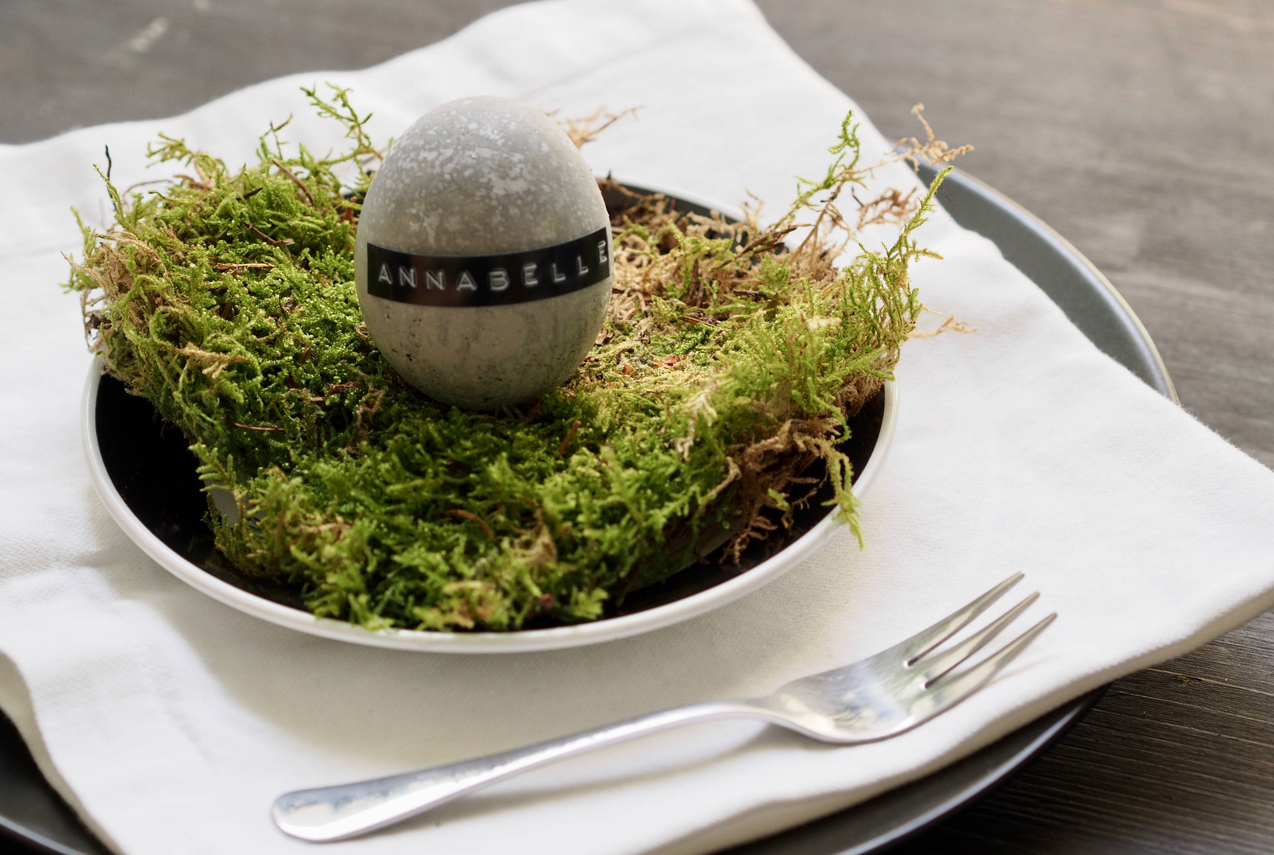 1. Betoneier im Moosbett – Tischdeko zu Ostern basteln. Sie wünschen sich etwas Abwechslung abseits der klassisch gedeckten Ostertafel mit bunten Frühlingsblühern? Dann heißt es: „Ärmel hoch“. Denn diese Eier aus Beton sind selbst gegossen und machen ganz schön was her – als Deko-Eier oder auch, wie hier, als Tischkarten passen sie perfekt in eine moderne Umgebung.