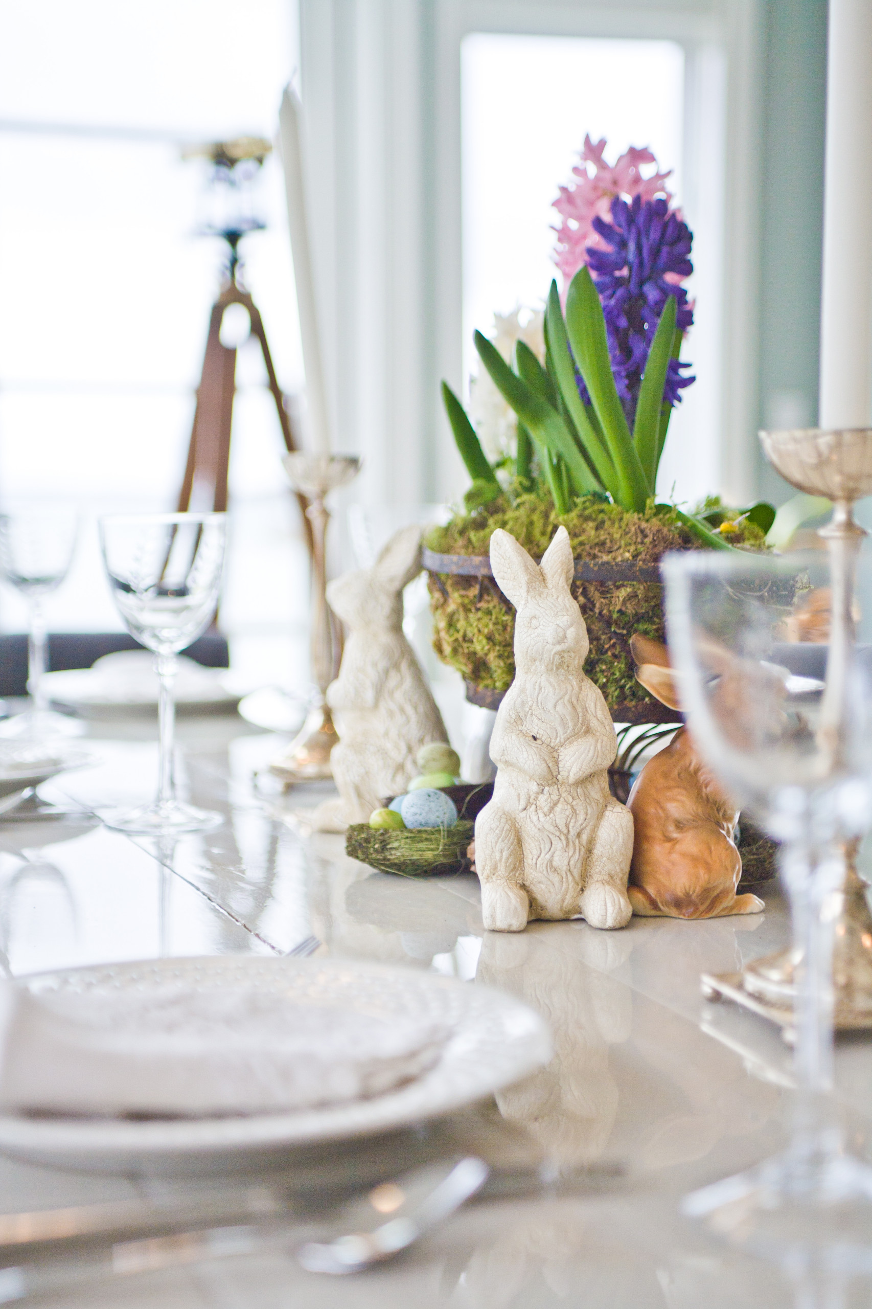 8. Klassische Ostertischdeko mit Hasen. Aufmerksam beäugt auf dieser Festtafel eine Gruppe zerbrechlicher Hasen das Geschehen. Sie bewacht die kleinen bunten Schokoeier, die unterhalb des Tischgestecks liegen, einer klassischen Schönheit mit betörendem Duft, den die Hyazinthen im Raum verbreiten.