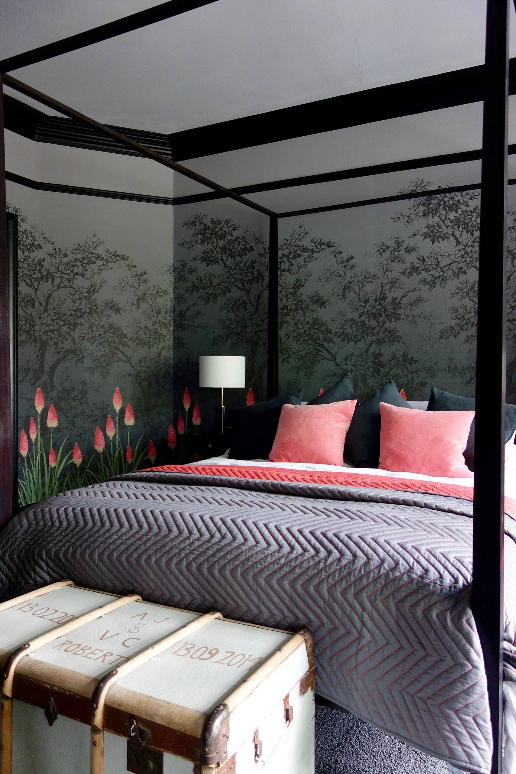 Elegant, modern und einzigartig: Die Tapete „Upper Brook Street – Minuit“ von Little Greene sorgt mit pinkfarbenen Fackellilien vor grauem Stag-Toile-Motiv für genau die richtige Dosis Extravaganz in diesem modernen Schlafzimmer.