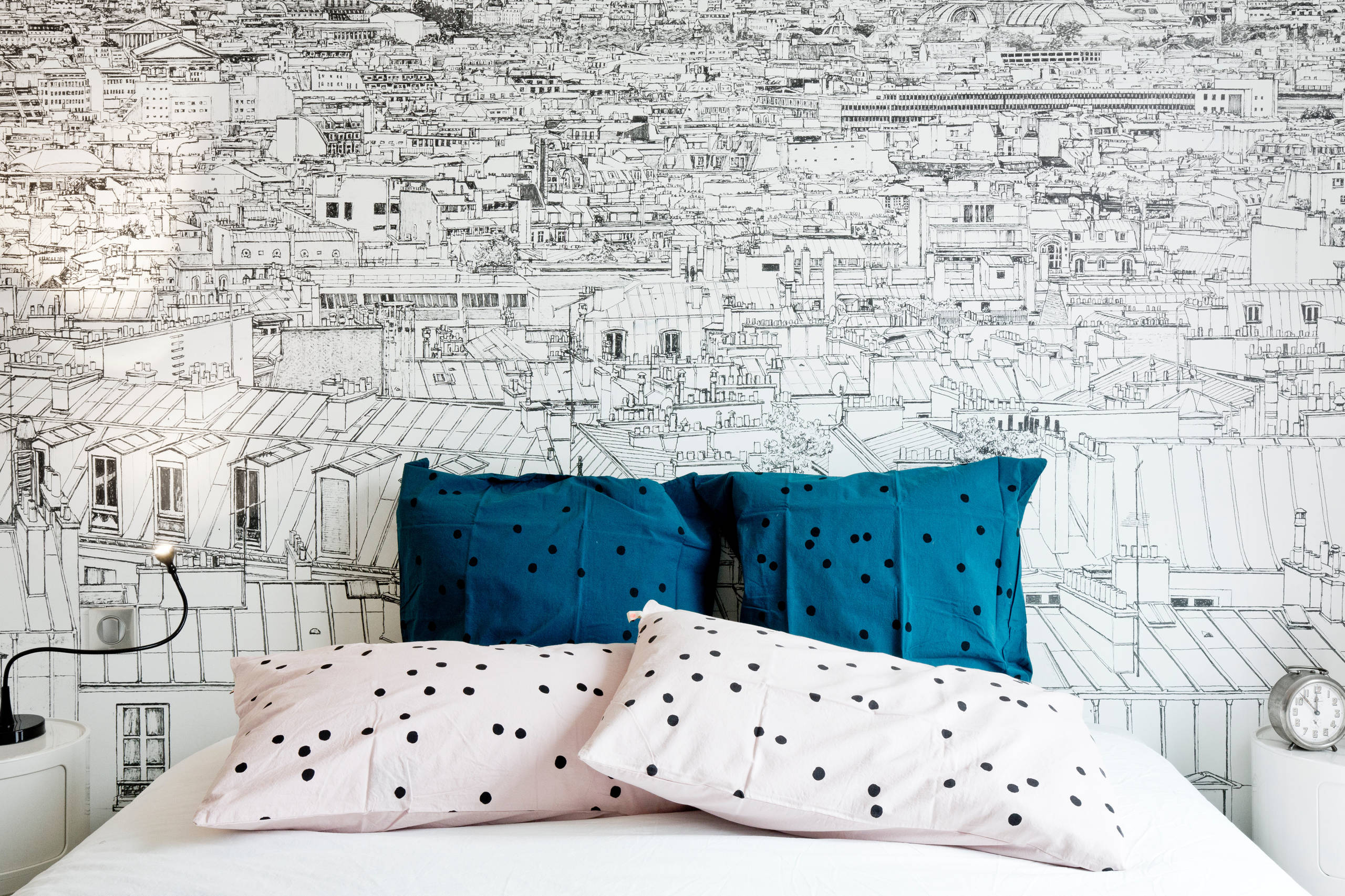 Eine französisch-skandinavische Koproduktion ist dieses Schlafzimmer, in dem die Wand am Kopfende des Bettes die Tapete „Vue de Paris“ von Ohmywall schmückt. Zwar gehört der Raum zu einer hell und unbeschwert eingerichteten Familienwohnung südlich von Paris, doch mit viel Weiß und sparsam dosierten schwarzen Akzenten könnte sich das Schlafgemach genauso gut in Kopenhagen oder Stockholm befinden.