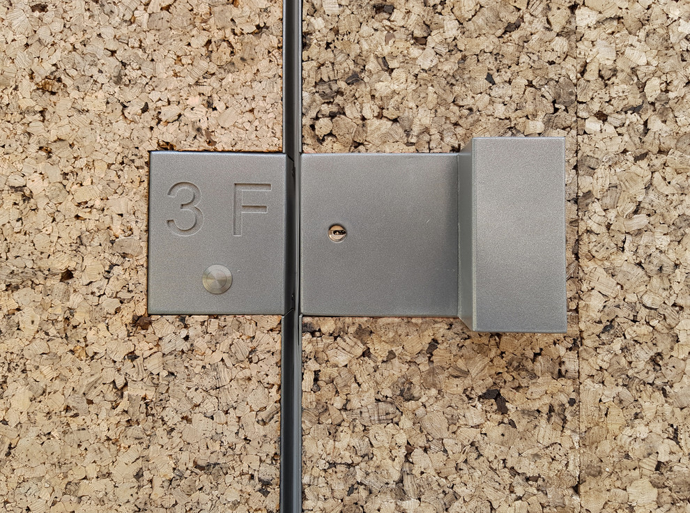 Klingelschild und Türbeschlag sind in die Korkfassade eingearbeitet. Die gesamten Fassaden des Hauses, wie auch die Dachflächen (mit Ausnahme der Bereiche mit Solarpaneelen) wurden mit den Korkplatten verkleidet.