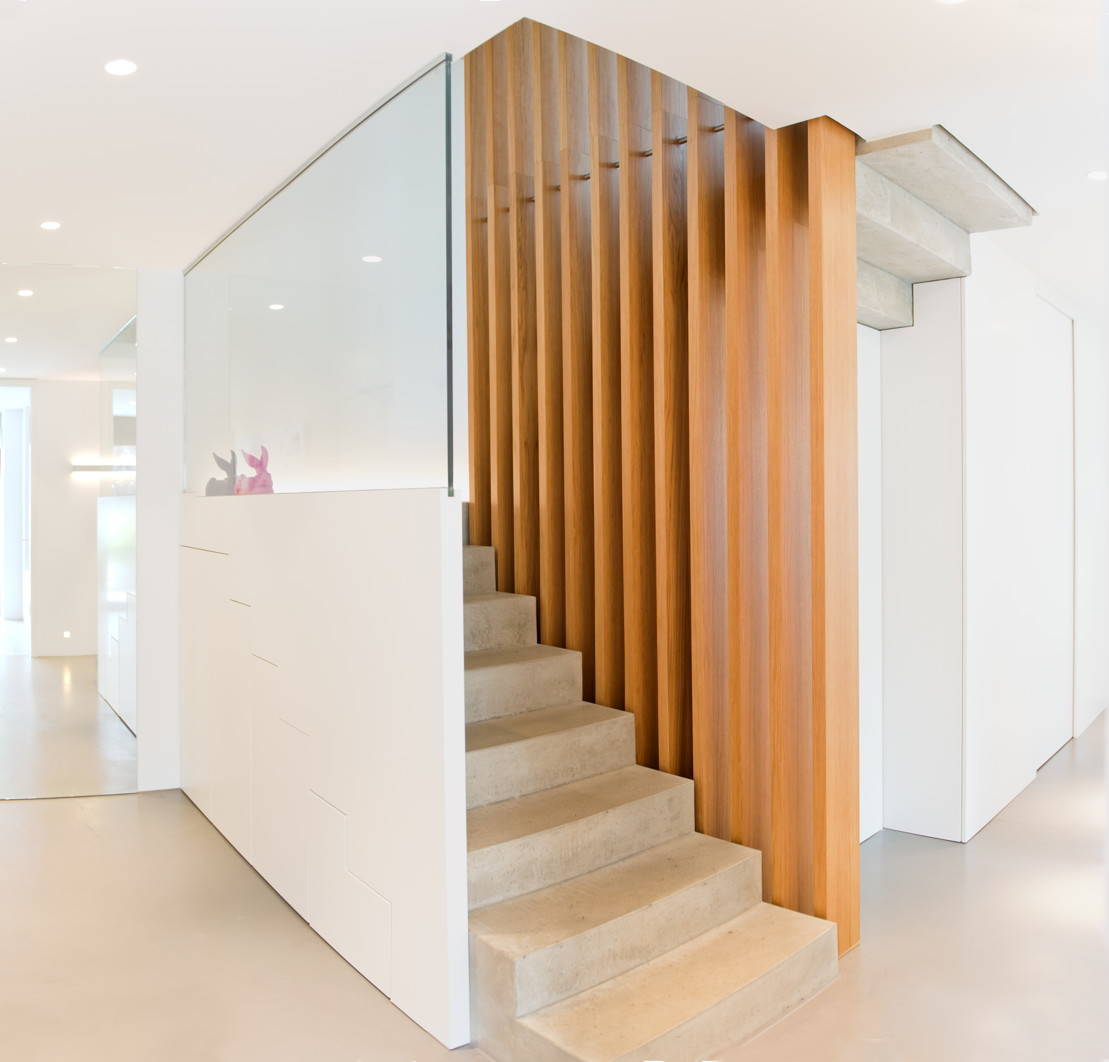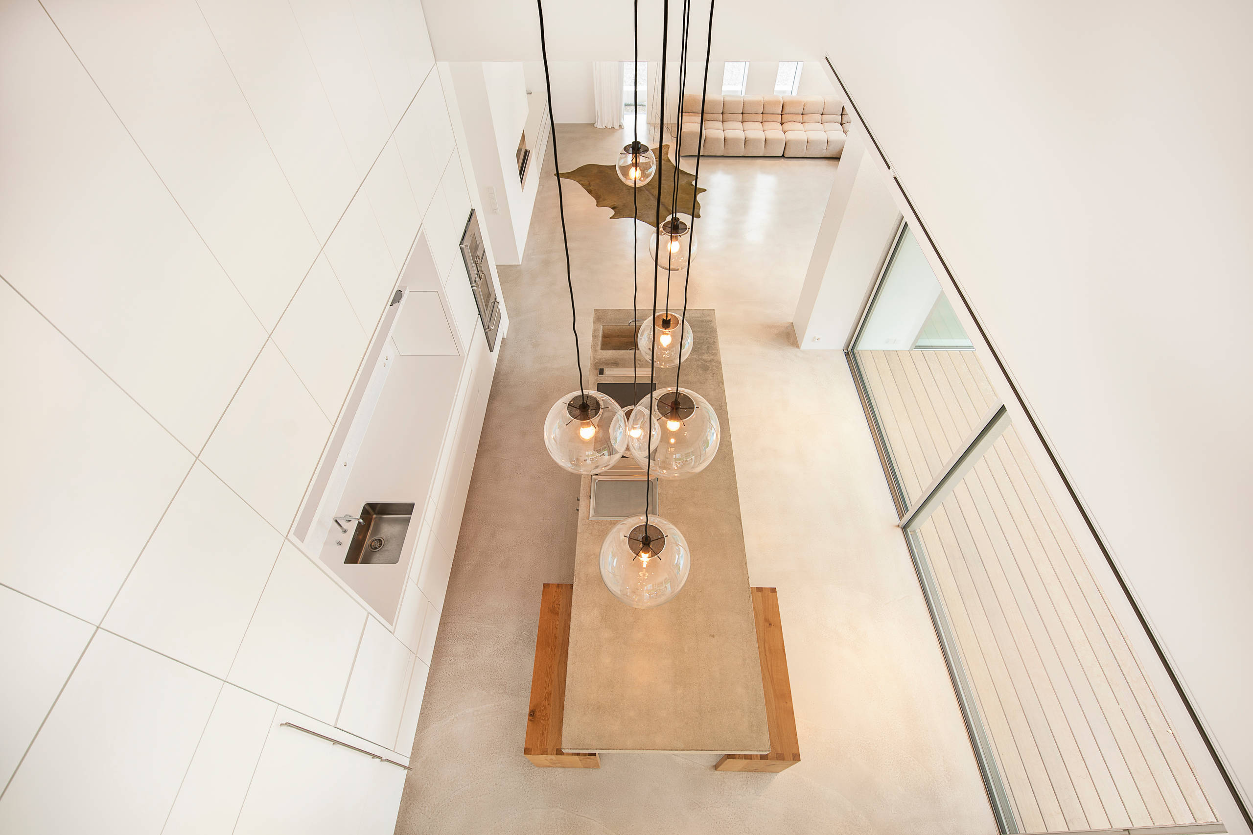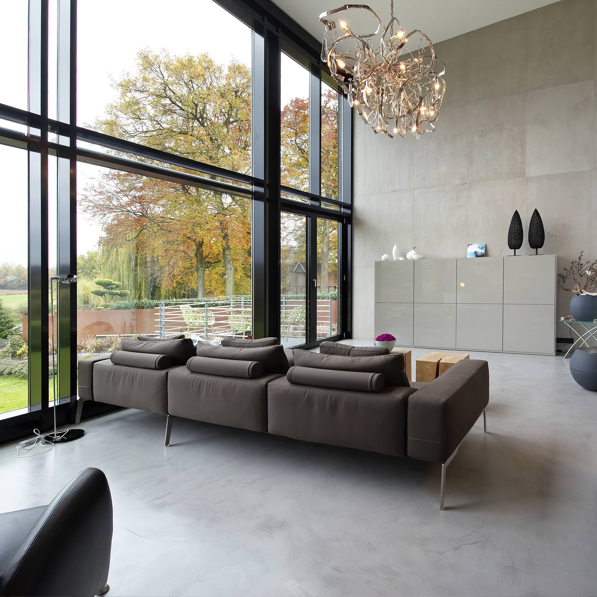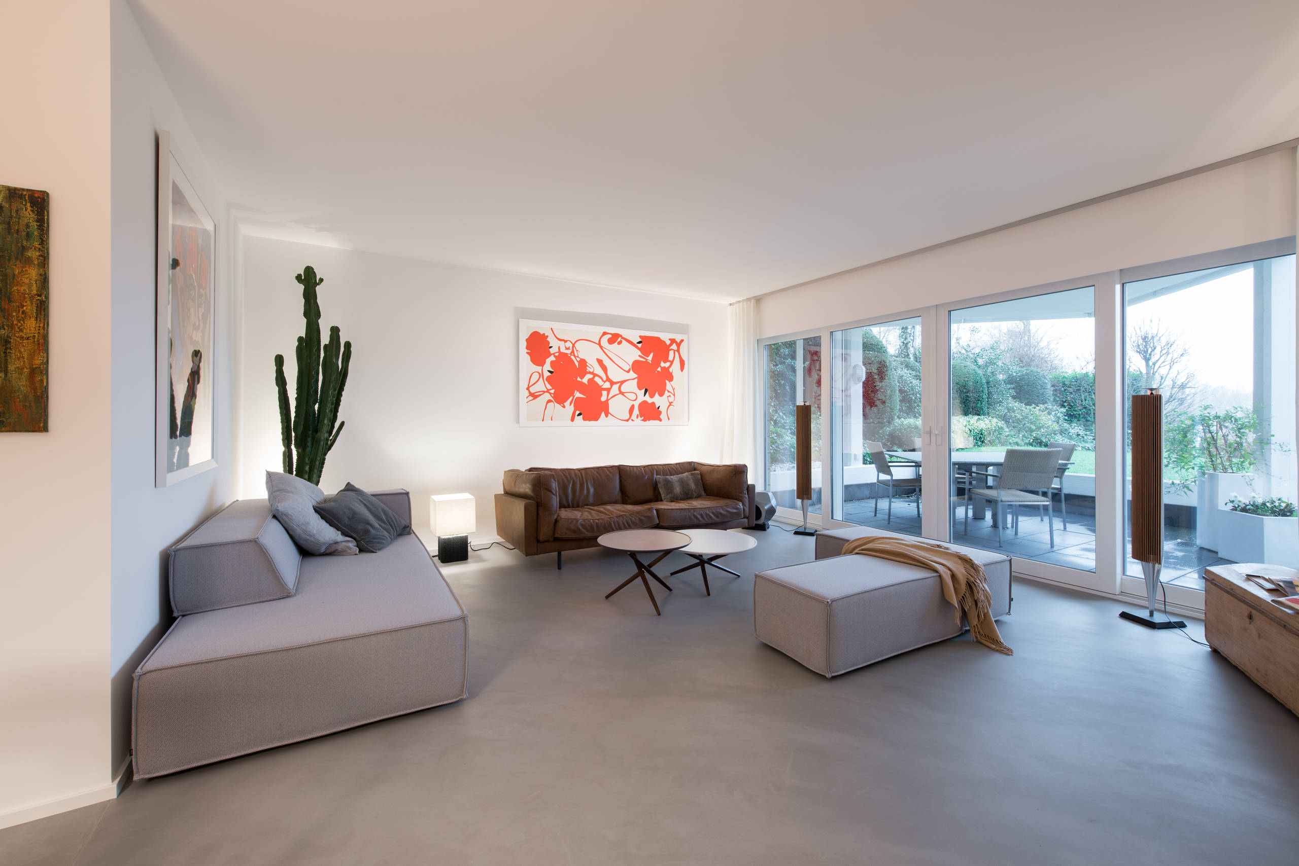 In diesem Zuhause wurde im gesamten Wohnbereich ein fugenloser Zementspachtelboden verlegt