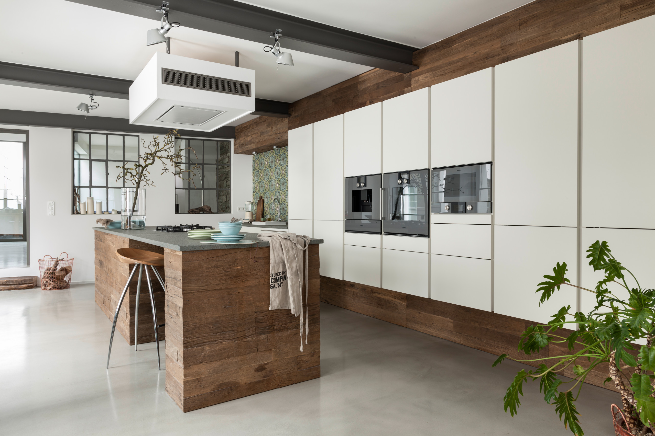 Ein grauer Estrichboden, Holz und weiße Küchenfronten – aufregend und subtil zugleich zeigt sich diese Küche