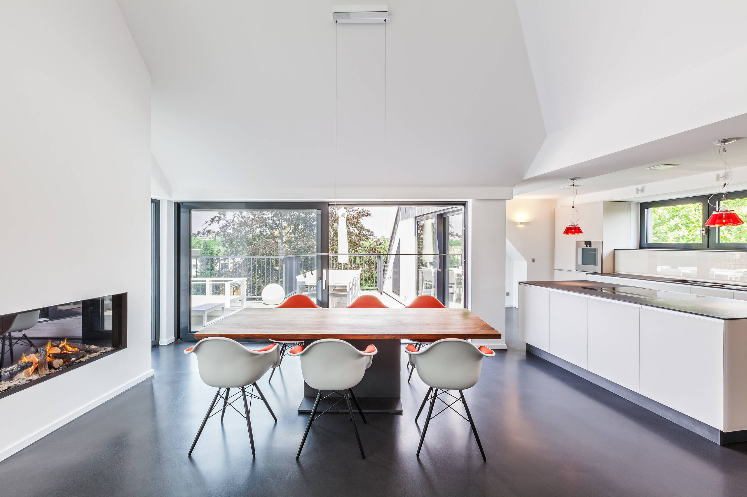 Bei der Umgestaltung dieses Esszimmer setzte Interior Designerin Stefanie Raum auf fugenlosen, gespachtelten Kalkboden: „Der Boden ist atmungsaktiv und passt zum Ton der umliegenden Fliesen.“