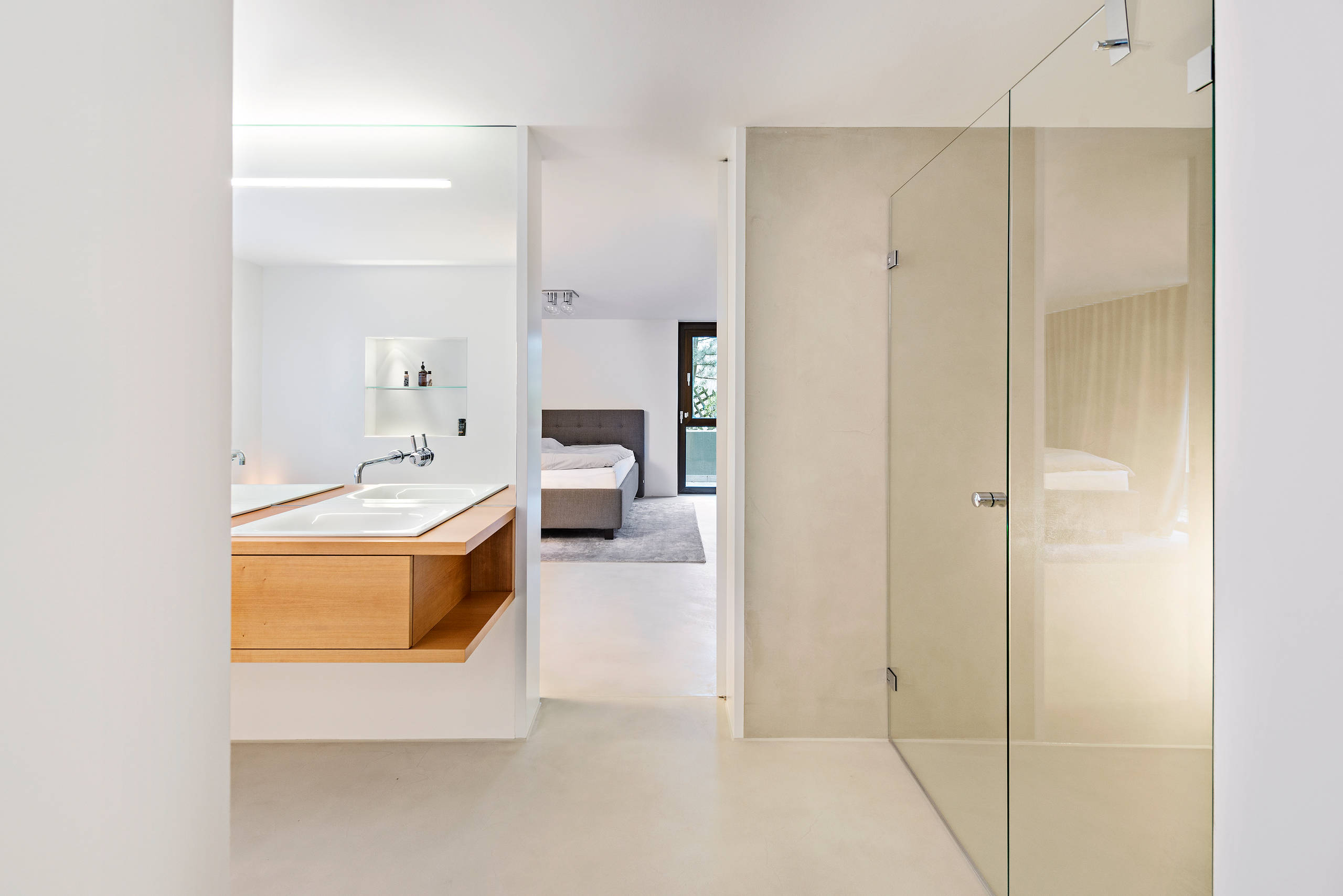 Der fugenlose Boden wurde auf einen alten, tadellosen und rissfreien Fliesenbelag mit Fußbodenheizung gespachtelt, zum Finish und Fleckenschutz matt versiegelt