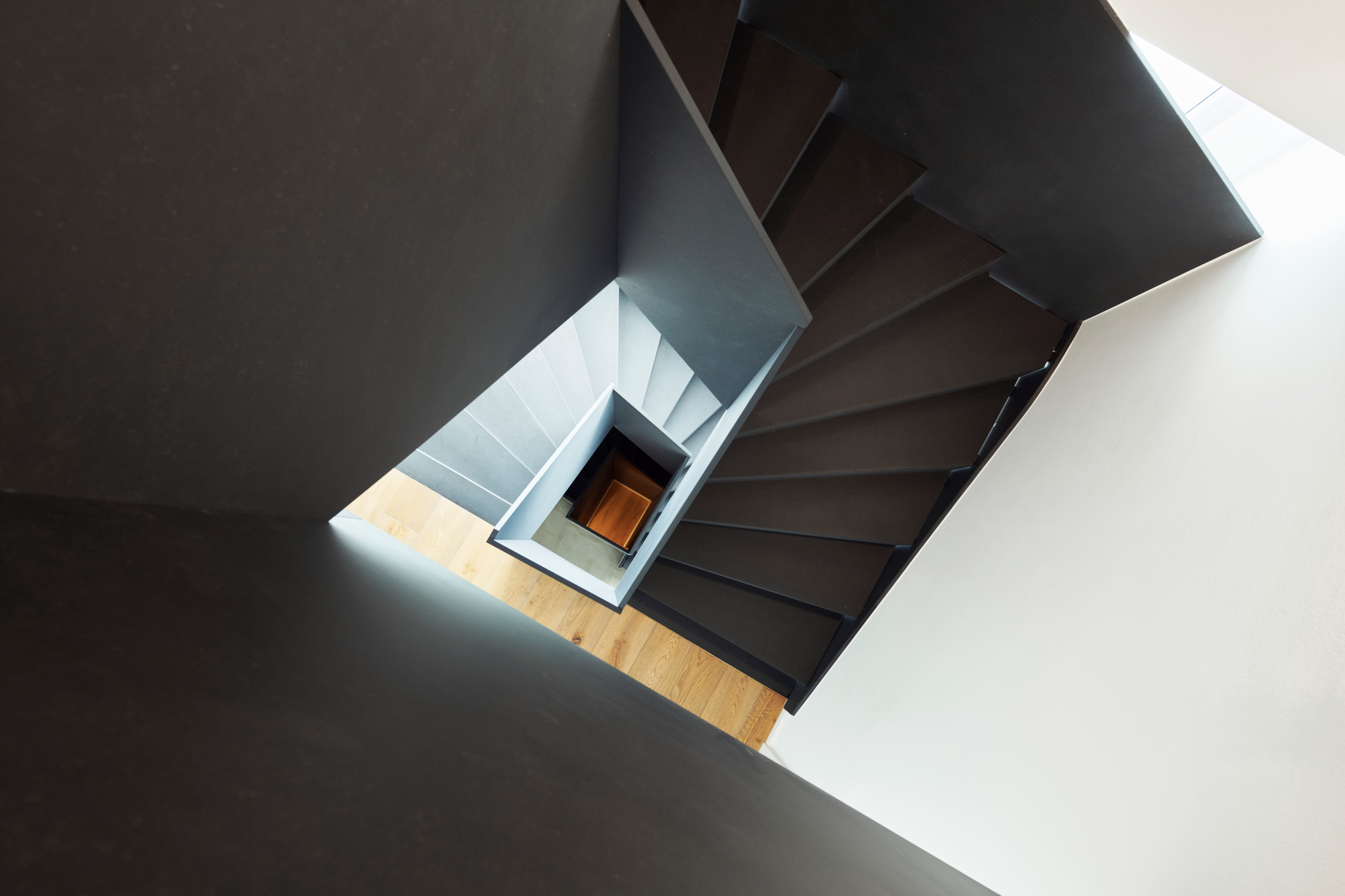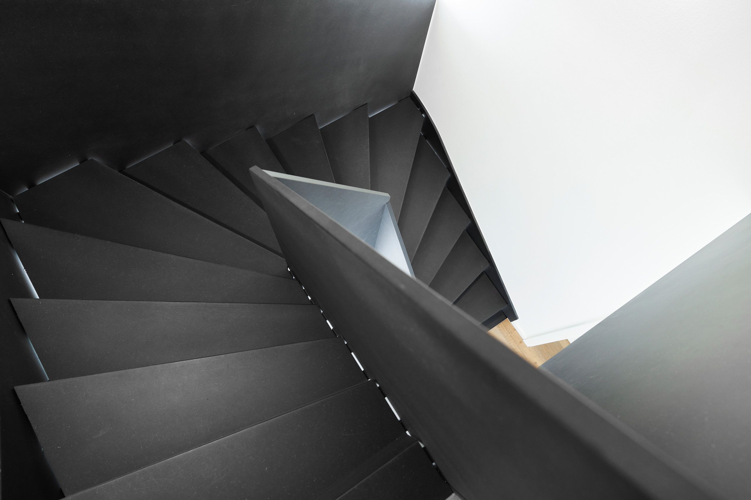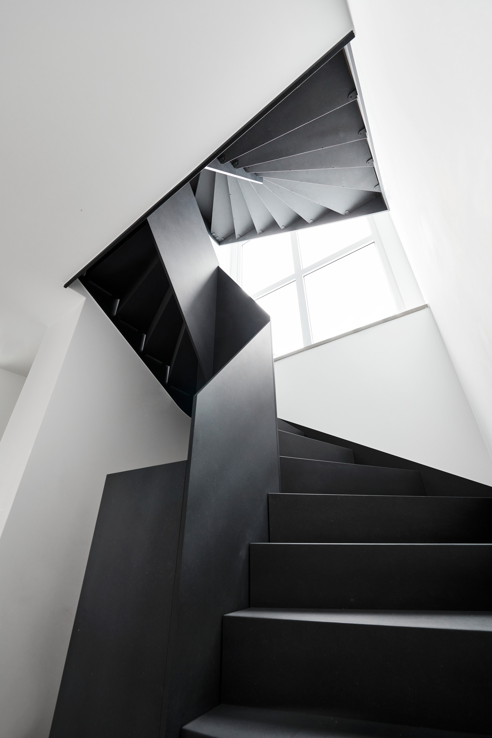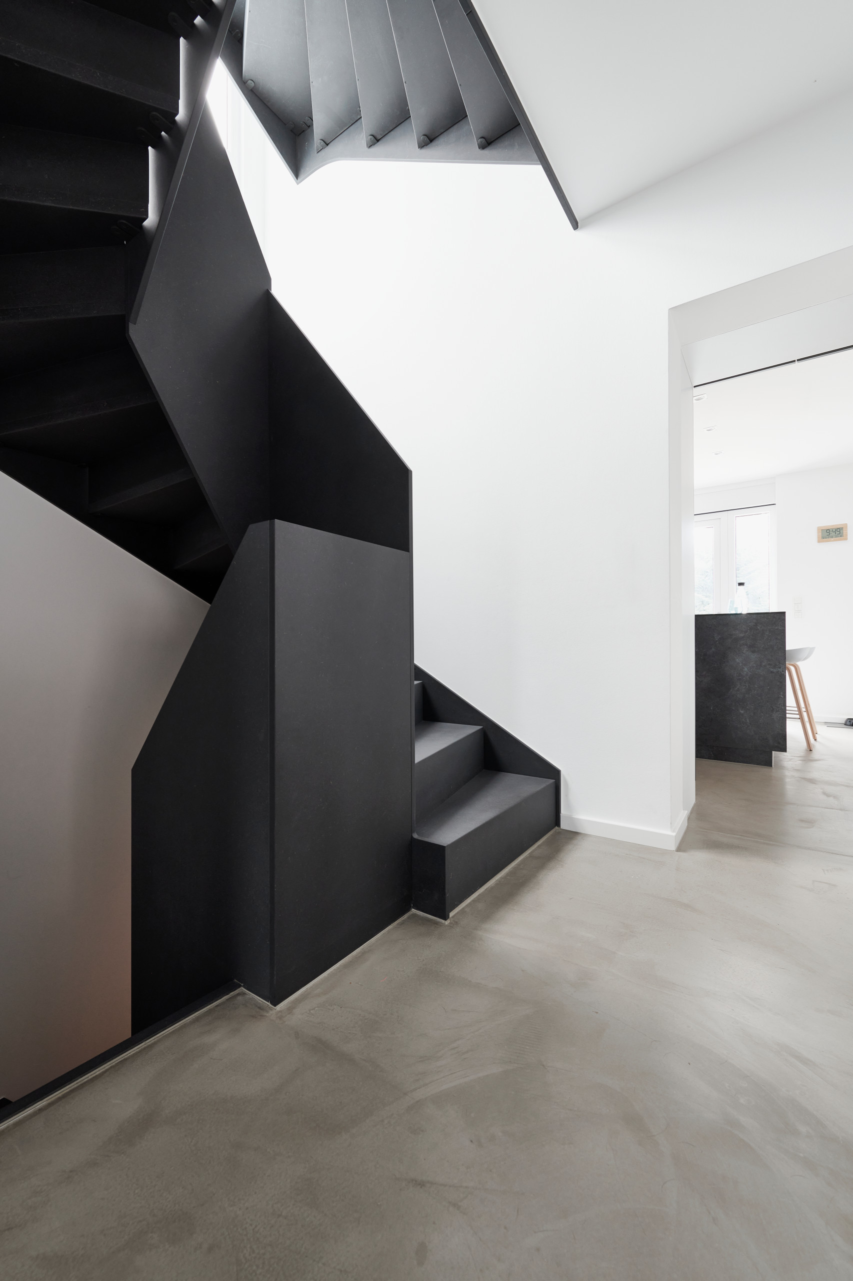 Statt der alten Treppe mit schmiedeeisernem Geländer entfalten sich die neuen, schwarzen Treppenläufe wie eine Skulptur über vier Etagen. Die Treppe führt vom Erdgeschoss in den Keller und in die erste Etage, von dort aus geht es weiter ins Dachgeschoss: „Das ist ganz typisch für das Ruhrgebiet.“
