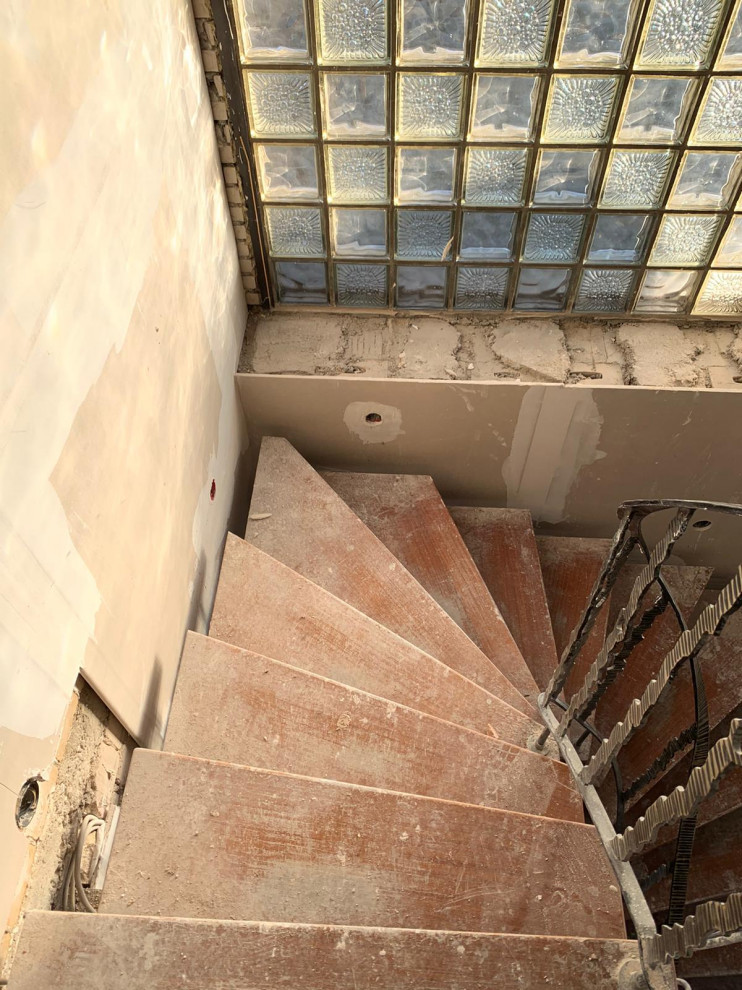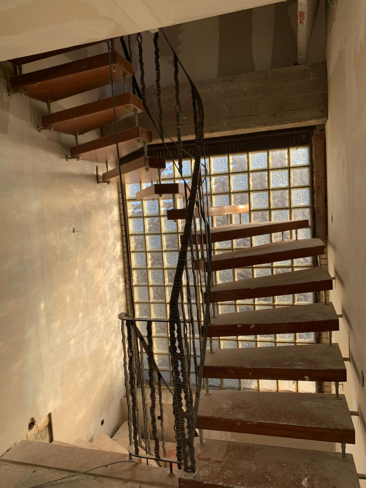 Das Haus aus den Sechzigern wurde entkernt, teilweise wurden Wände rausgerissen. Der Bau der Treppe war mit den Malerarbeiten und dem neuen Fußboden nach ungefähr vier Wochen abgeschlossen. Bei den Glasbausteinen war es auch Experte Brenscheidt, der seinen Kunden dazu riet, sie doch lieber durch die jetzigen Fenster zu ersetzen: „Das ist auch thermisch viel besser.“