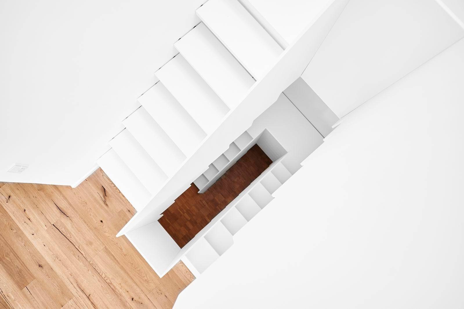 Die Treppe entspricht der DIN-Norm und folgt der Schrittmaßregel, die das Steigungsverhältnis festlegt und so die Anzahl der Stufen zwischen den verschiedenen Ebenen bestimmt. Die Haupttreppe hat bei diesem Projekt vom Erd- ins Obergeschoss sowie von dort ins Dachgeschoss jeweils 15 Stufen, während 13 Stufen in den Keller führen.