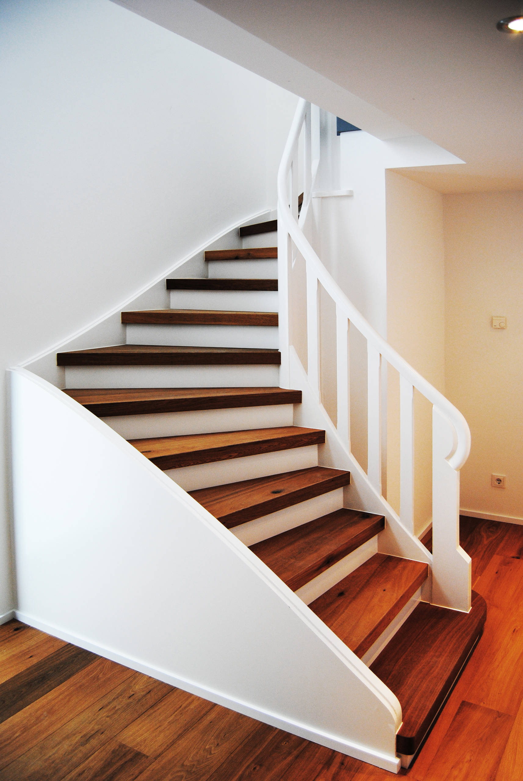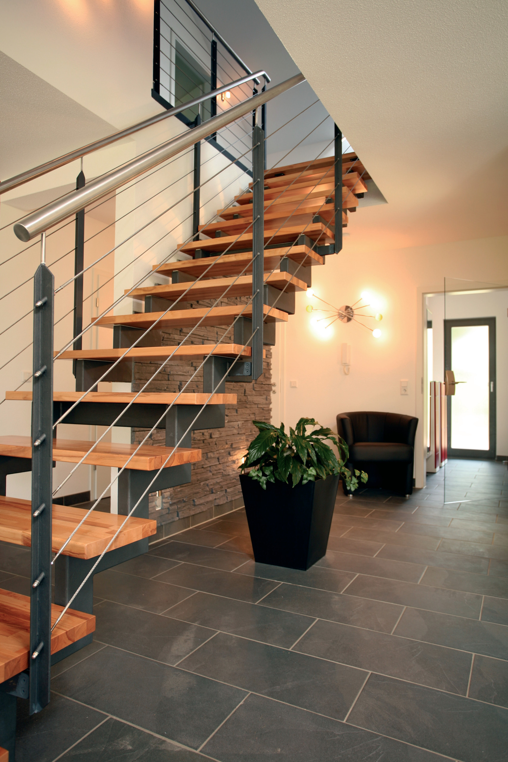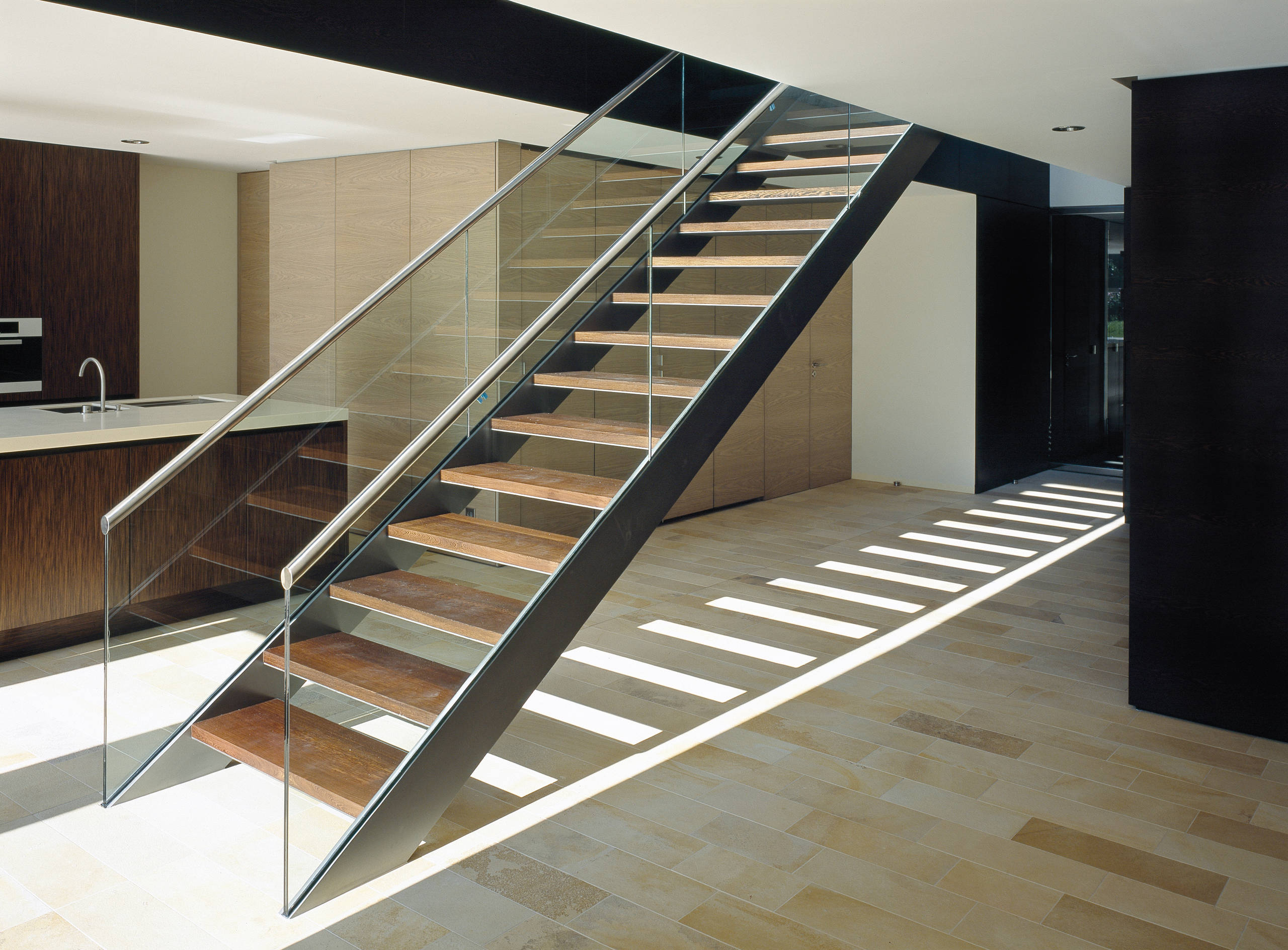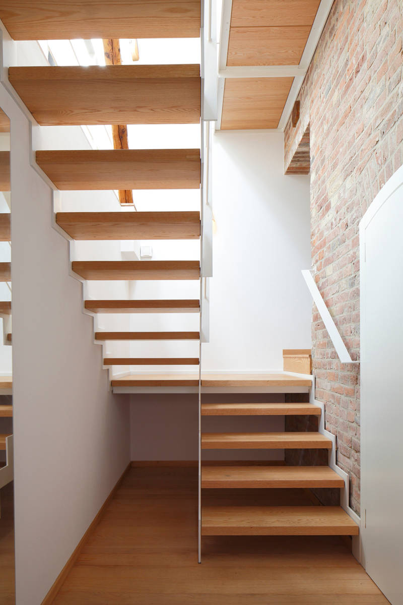 Im Vergleich zu halbgestemmten besitzen ganzgestemmte Wangentreppen, wie diese vom Architekturbüro Guido Seidel, senkrechte Setzstufen zwischen den Trittstufen und wirken dadurch massiver. Man bezeichnet sie auch als „geschlossene Wangentreppen“. Diese Form bietet sich an, wenn man den freien Platz unter den Stufen als Stauraum mit Einbauschränken oder Regalen nutzen möchte.