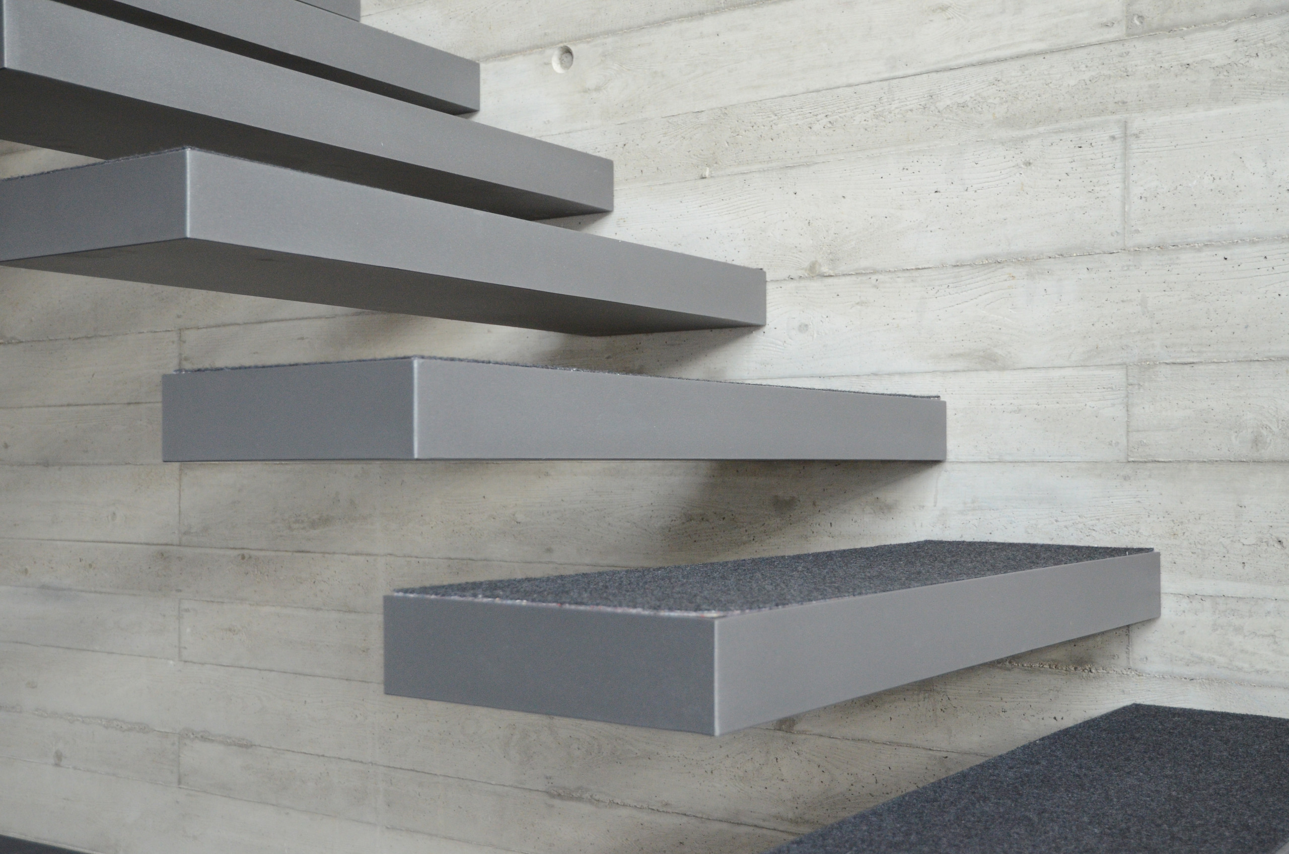 Doch Kragarmtreppen sind auch aus massiveren Materialien realisierbar – hier ein Beispiel aus Metall mit textilem Belag von Spitzbart Treppen.