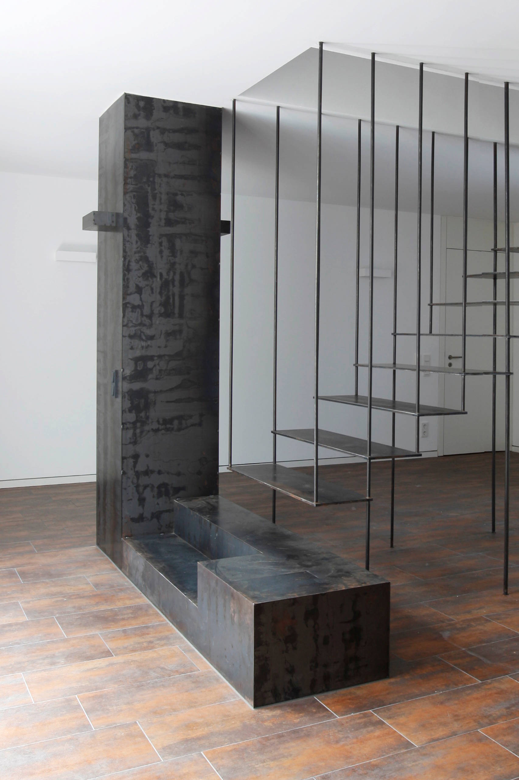Abgehängte Treppen sind nicht an der Wand oder dem Boden, sondern direkt an der Decke befestigt. Seile oder, wie in diesem Beispiel, Rundstäbe tragen die eingehängten Stufen. Womöglich fühlt man sich beim Benutzen dieser Treppe von M. Schneider und A. Hillebrandt Architektur an Schaukeln erinnert. Tatsächlich sind auf diese Weise aufgehängte Treppen vibrationsempfindlich, es ist jedoch Vorschrift, sie derart einzuspannen und zu fixieren, dass ihre Benutzer beim Treppensteigen nicht ins Schaukeln geraten. Die Geländer können unterschiedliche Formen annehmen, die von filigranen Stäben bis hin zu breiten Paneelen reichen.
