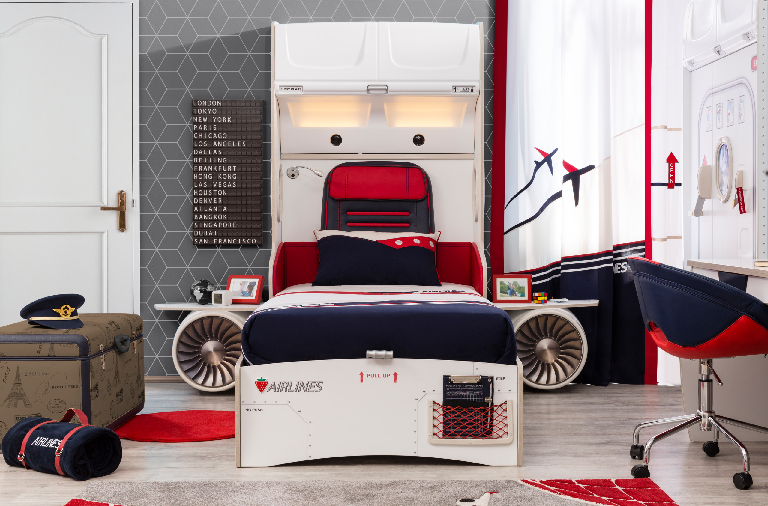 Details wie die Anzeigetafel neben dem Bett, das Netz für Zeitschriften am Fußende und die Vorhänge mit Flugzeug-Dessin versetzen jeden kleinen Schläfer ins Cockpit seiner Träume.