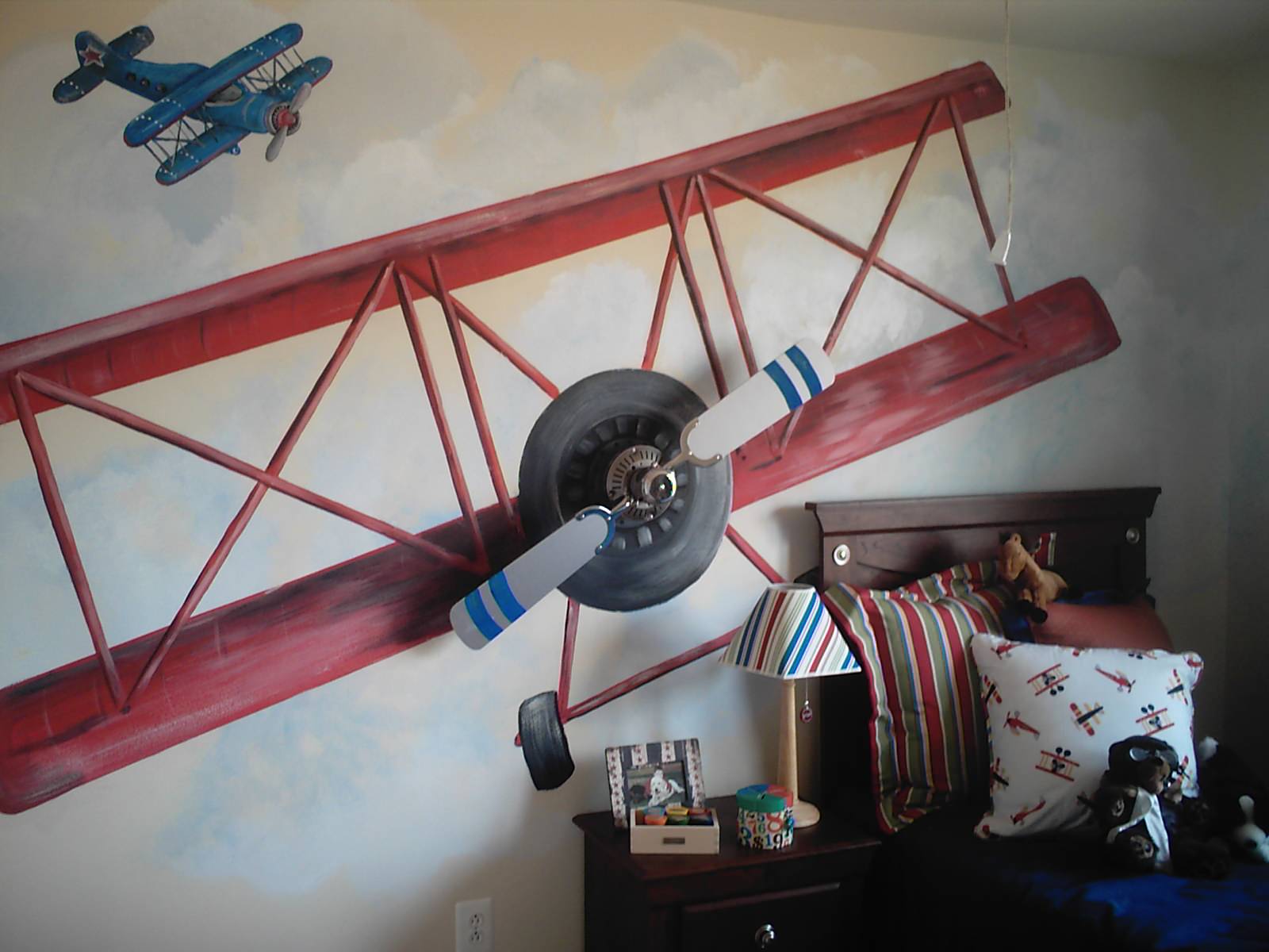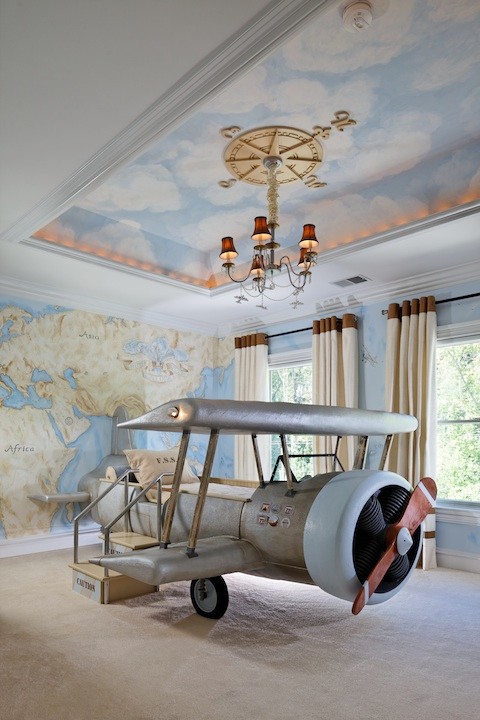 Wandmalerei mit 3D-Effekt macht dieses Kinderzimmer in Atlanta lebendig; der Propeller des Doppeldeckers ragt in den Raum und kann sich drehen! Die amerikanische Künstlerin Anita Roll verziert Wände mit selbstgemalten Motiven von der Riesenkrake bis zur Skyline – und macht so jeden Raum zu einem Gesamtkunstwerk.