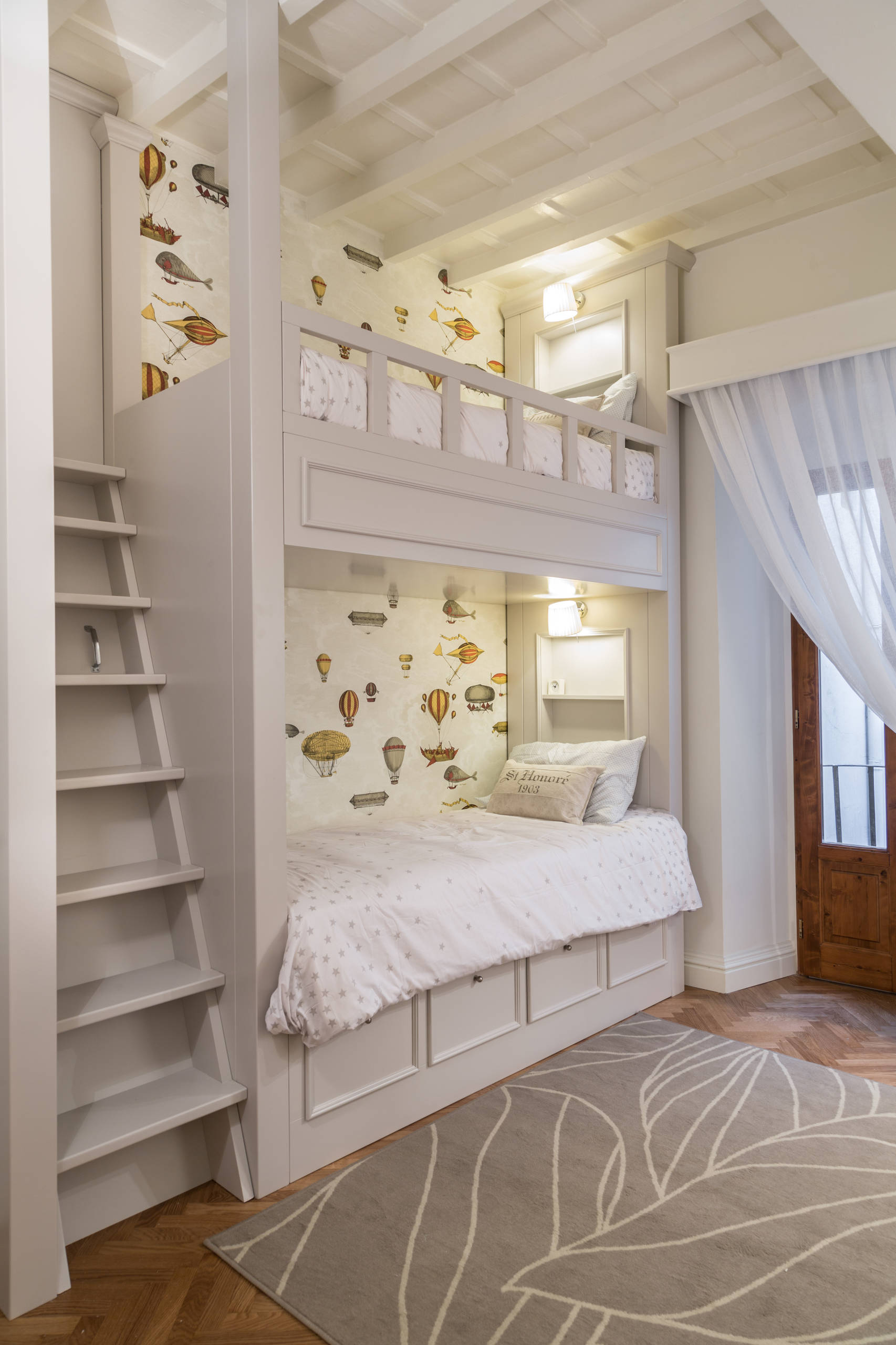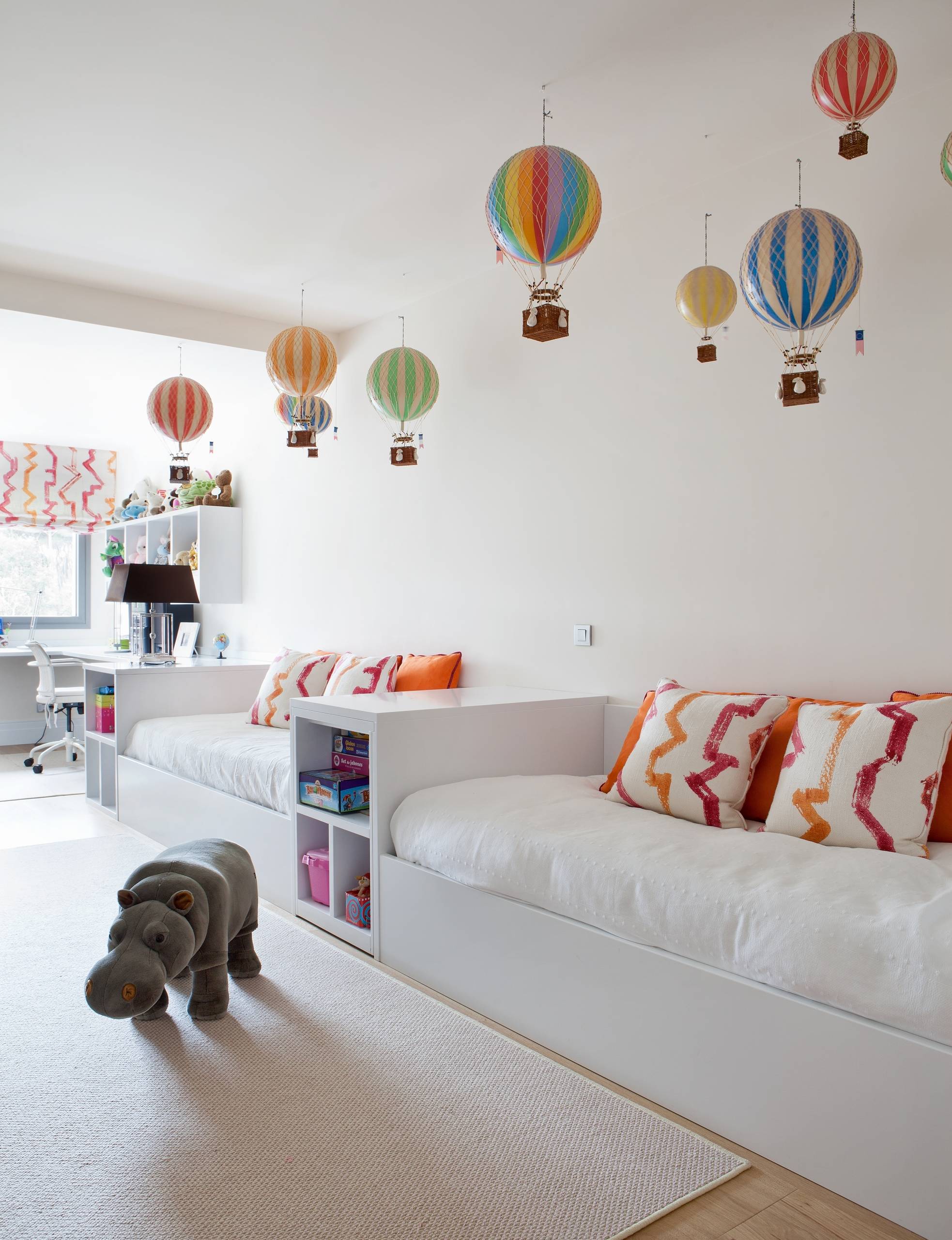 In dem mit viel weiß gestaltetem Kinderzimmer in Madrid schwebt gleich eine ganze Gruppe bunter Heißluftballons unter der Decke. Interior Designerin Covadonga Cánovas fand sie auf einem Flohmarkt in Amerika und brachte damit einen nostalgischen und gleichzeitig verträumten Charme in den Raum.