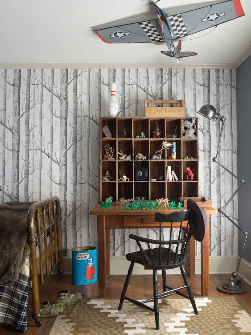 Am liebsten lässt der junge Bewohner eines Farmhauses in Connecticut seinen Drachen auf den Feldern der Umgebung steigen. Bei Windstille schmückt dieser die Zimmerdecke vor seinem alten Schreibtisch und ergänzt so den nostalgischen Charme, den der Raum ausstrahlt.