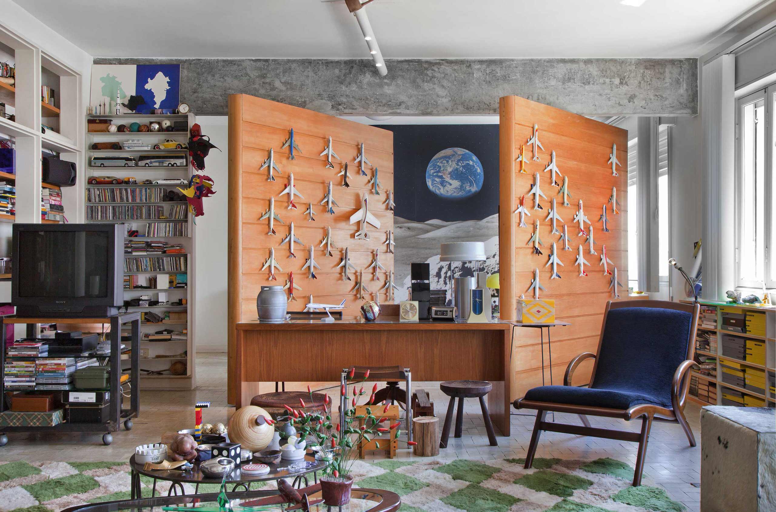 Auch wenn es sich bei diesem Raum eines Hauses in Brasilien nicht um ein Kinderzimmer handelt, kann diese eindrucksvolle Präsentation einer Sammlung von Modellflugzeugen hervorragend als Inspiration dienen: zwei holzverkleidete Drehtüren dienen als vertikales Display und geben außerdem den Blick auf unseren blauen Planeten dahinter frei. So erhält der Raum eine zusätzliche Dimension und die Flugzeuge eine repräsentable Ausstellungsfläche.