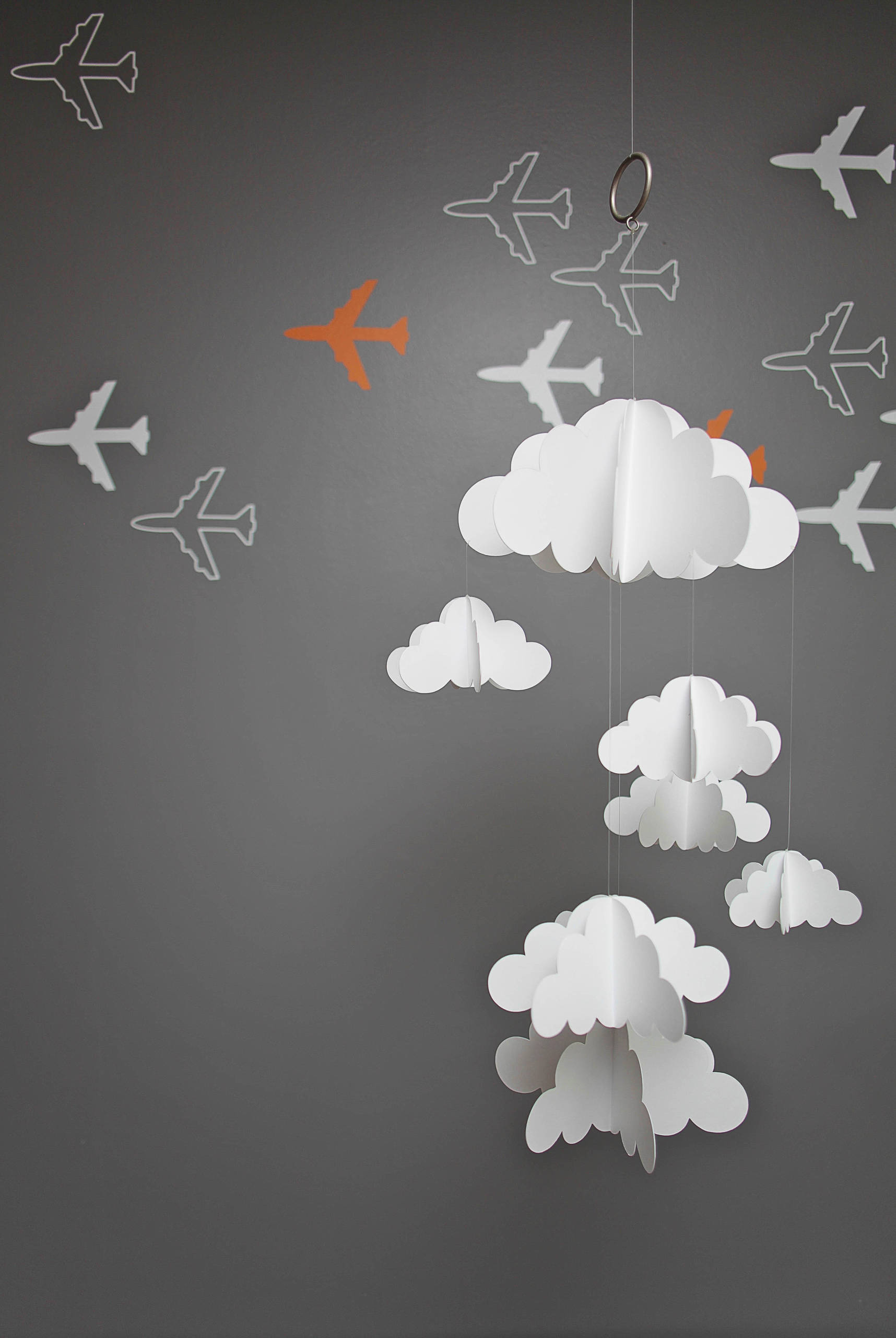 Nicht nur schön für die Kleinsten: ein Wolkenmobile sorgt für eine stimmungsvolle Kulisse durch den der geübte Flugzeugführer seine Maschinen sicher durchbringen muss und fügt dem Wandtattoo die dritte Dimension hinzu.