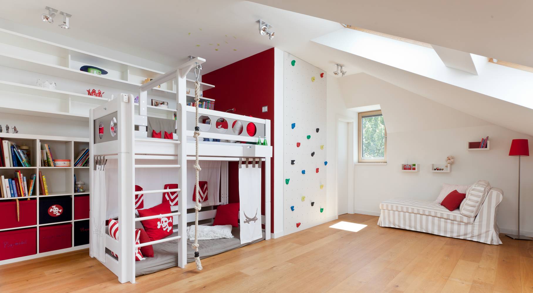 Ebenfalls einen großen Effekt mit relativ überschaubarem Budget erzielen Sie mit einer Kletterwand im Kinderzimmer. Für alle Gipfelstürmer, Klettermaxe und Sportskanonen eine schöne Abwechslung zur gewöhnlichen Hochbettleiter. Das Ganze steht und fällt sprichwörtlich mit der Wand, an der die Klettergriffe montiert sind. Ziehen Sie für die Installation einen Experten zurate, der der neuen Kletterwand stabilen Halt verleiht.