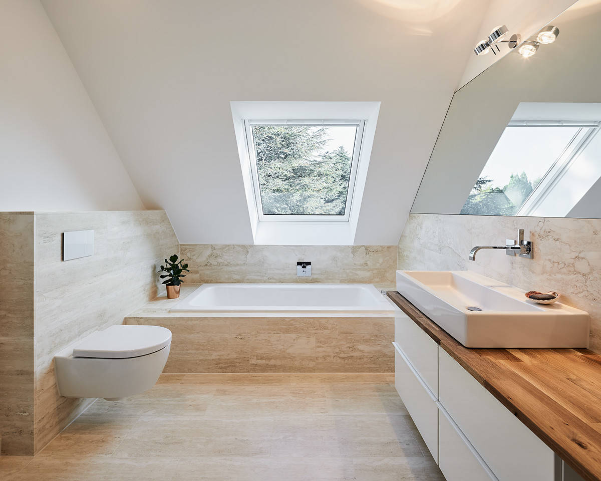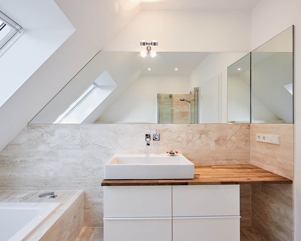 Neben der Wanne gibt es noch eine bodengleiche Dusche, die ebenfalls mit Travertin-Platten verkleidet ist (im Spiegel zu sehen). Der Spiegel ist maßgefertigt und passt sich der Dachschräge im Bad an.