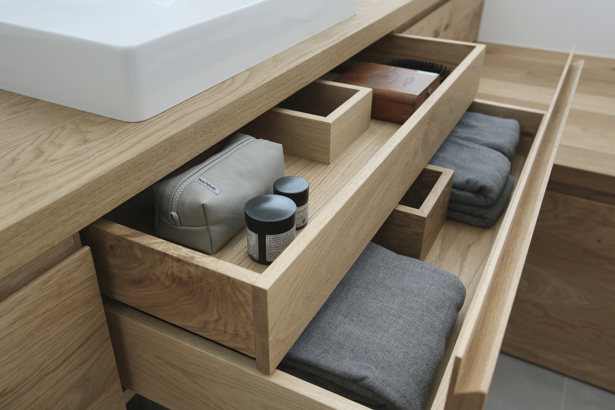 Alle Einbauten wurden vom Tischler gefertigt. Viel Stauraum integrierte die Innenarchitektin in den Waschtisch: Handtücher und Kosmetikartikel finden in insgesamt drei großzügigen Schubladen sowie in dem offenen Fach darunter Platz.