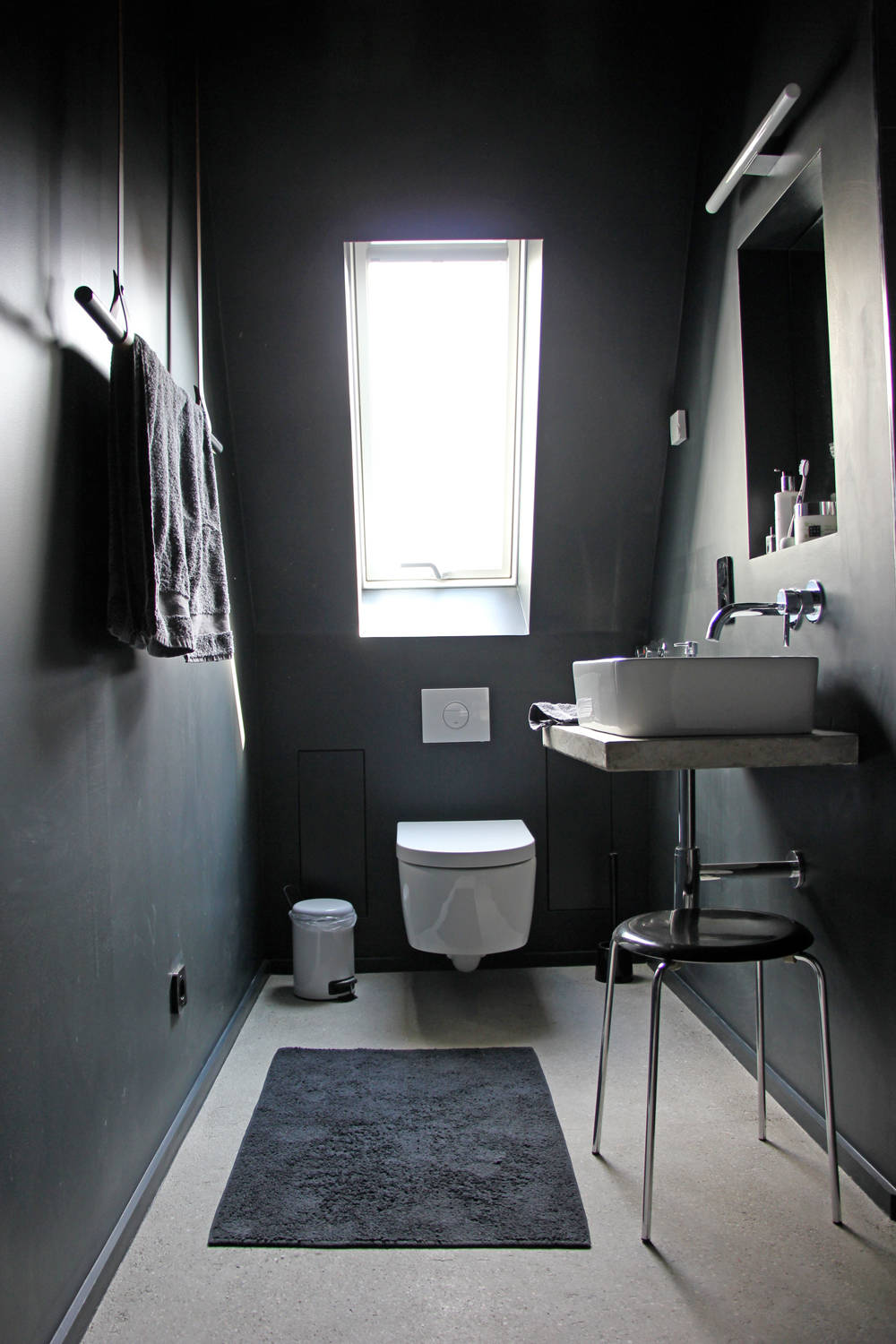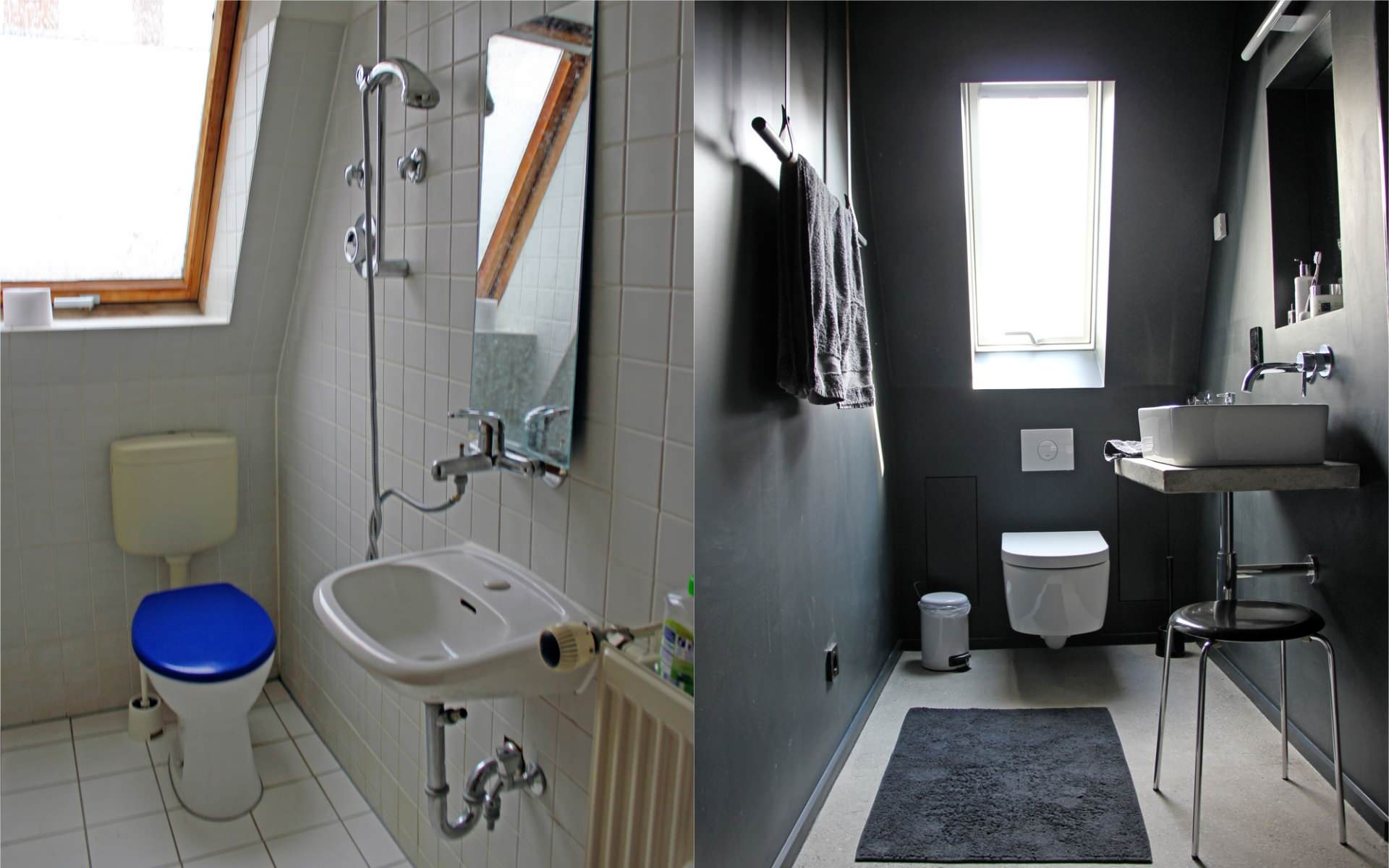 Vorher (links): Anne Schütz renovierte sich eigenhändig eine Dachgeschosswohnung in Berlin Mitte, die sie hauptsächlich als Büro nutzt. Das vorher recht trostlose Minibad sollte fugenlos werden und einen dunklen Farbanstrich bekommen. Getreu dem Motto: Klein, aber oho! „Vorher gab es hier nur eine Nasszelle und kein richtiges Badezimmer“, erinnert sich Schütz.