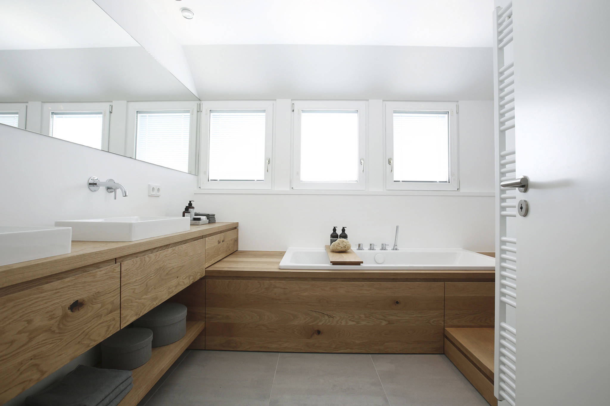 Nachher: Geradlinig, modern und trotzdem gemütlich wirkt das neue Badezimmer dank maßgefertigter Einbauten aus geöltem Eichenholz, weiß gespachtelten Wänden und dezent hellgrauen Bodenfliesen. Doppelwaschbecken, Badewanne und ein separater Duschbereich – das knapp acht Quadratmeter große Badezimmer bietet viel Komfort auf kleinem Raum. Nur auf ein WC verzichteten die Bauherren an dieser Stelle, denn im Obergeschoss gab es bereits eins. Die Wasseranschlüsse für das neue Elternbad ließ Eva Lorey hinter einer Trockenbauwandscheibe und den Flurschranktlang entlang versteckt verlegen.