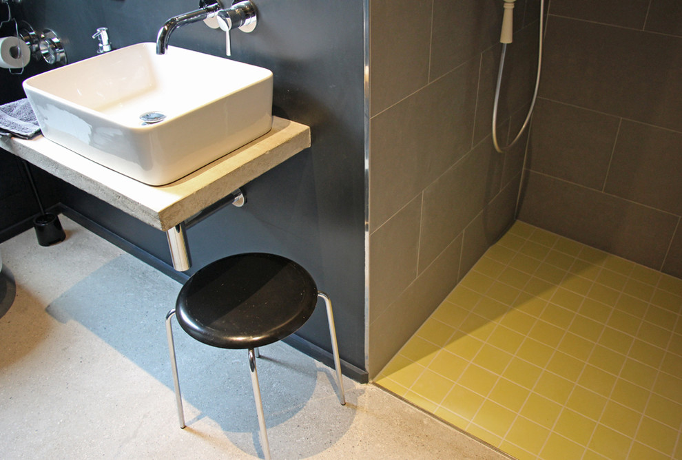 Nachher: Das Bad ist vom Flur aus erreichbar. Durch Versetzen der Wände entstand eine neue, einen Quadratmeter große Dusche, die gelb gefliest wurde.