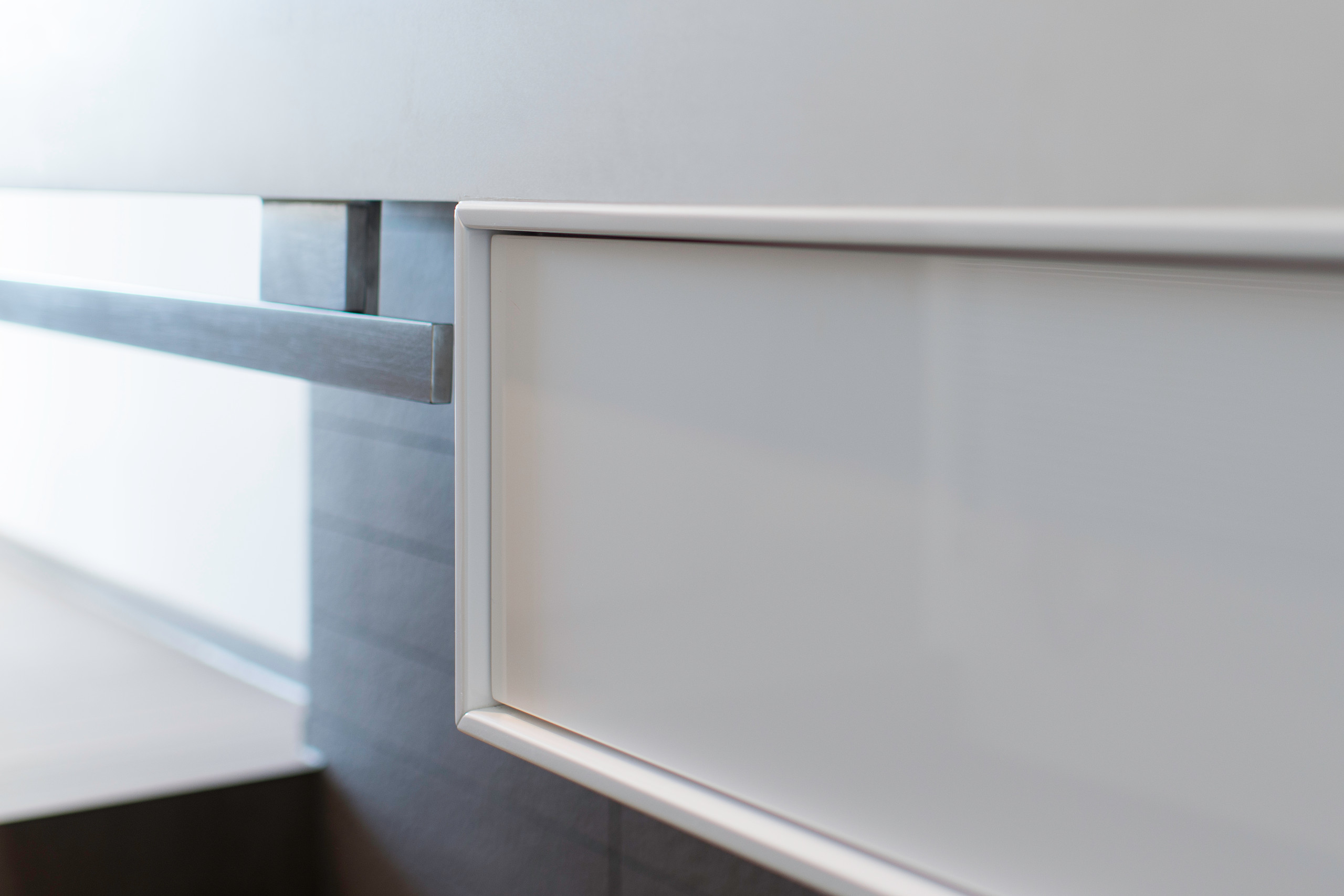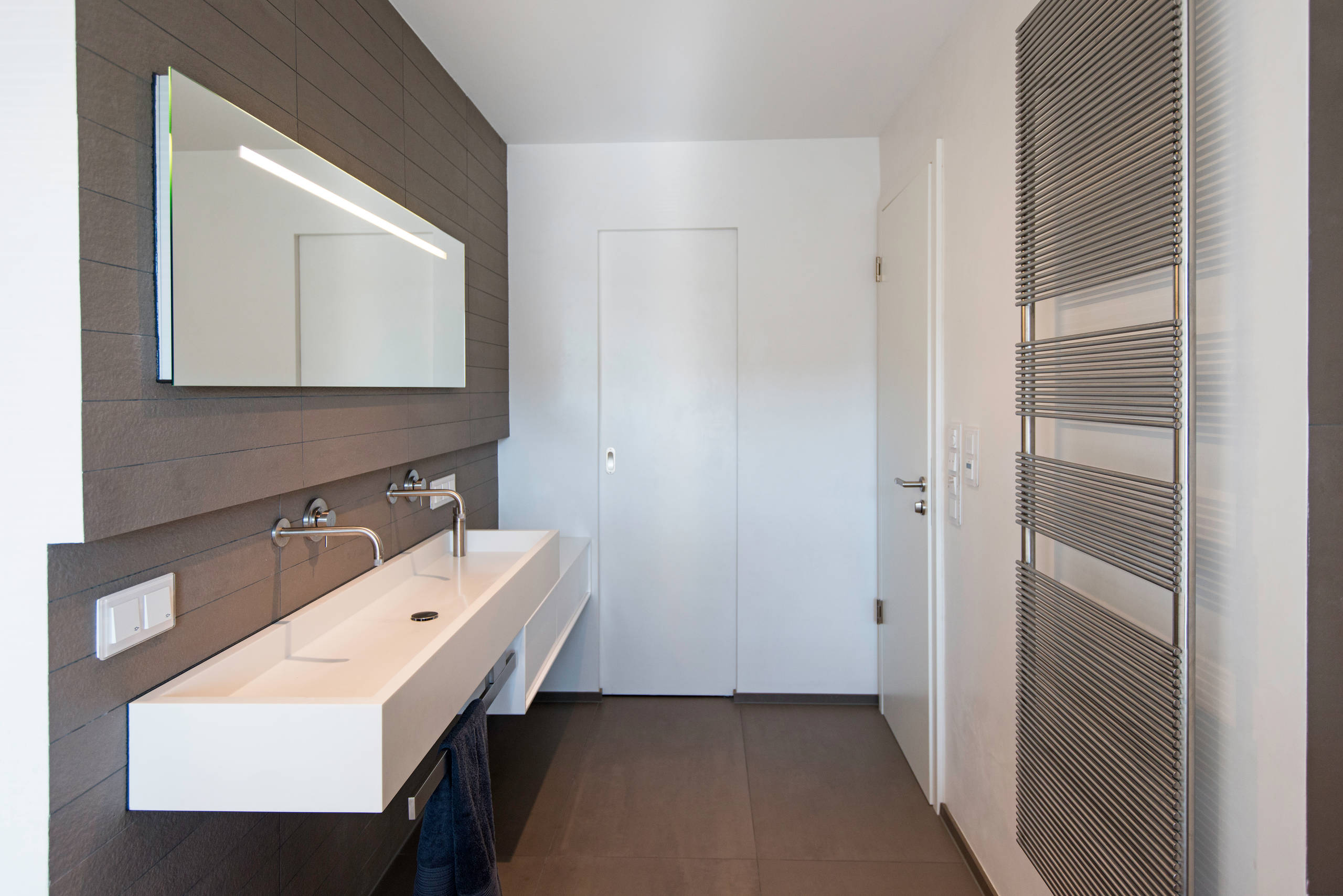 Den Handtuchhalter unter dem Doppelwaschbecken ließ Axel Fröhlich eigens für dieses Projekt anfertigen. Aus gebürstetem Edelstahl, passend zu den Armaturen.