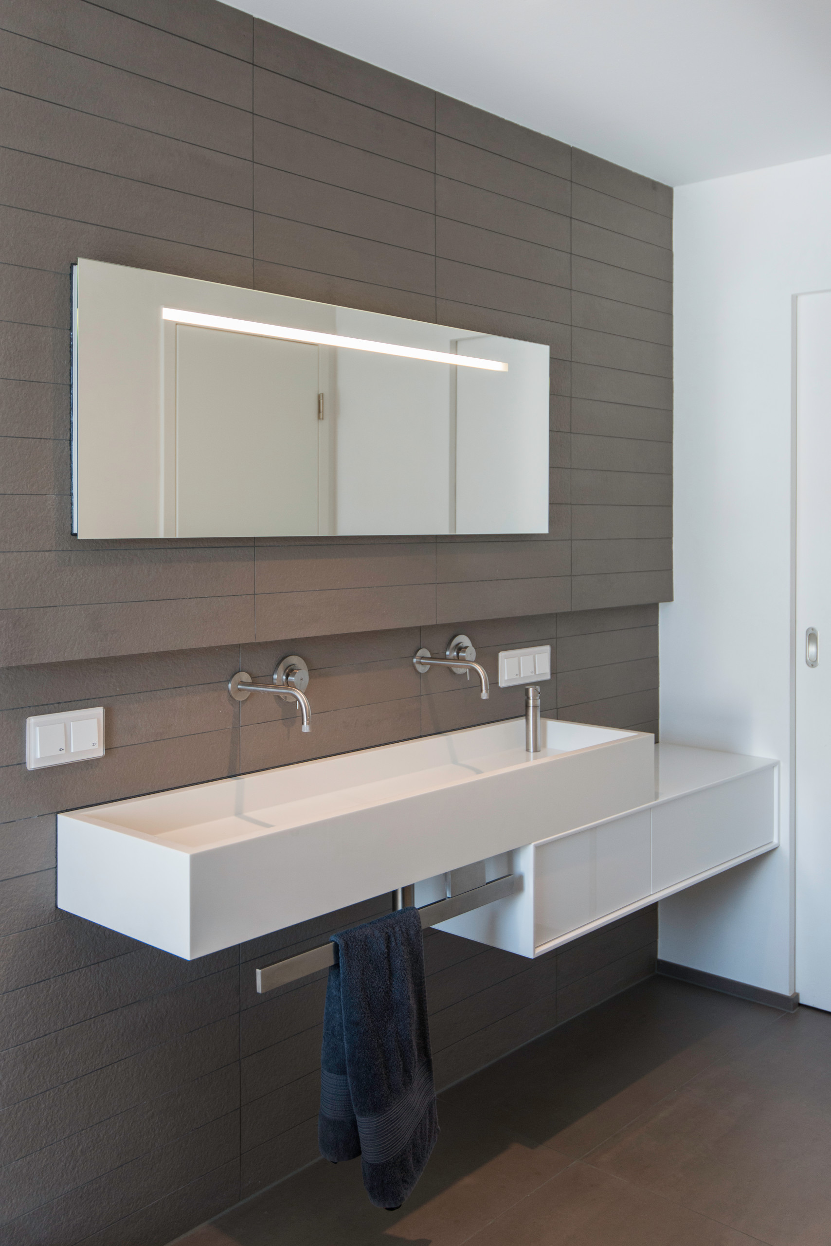 Doppelwaschbecken: Canal XXL, Axel Fröhlich; Spiegelschrank: Lumen, Axel Fröhlich; Wandschrank: Antonio Lupi; Handtuchhalter: eigene Anfertigung; Fliesen: Mosa