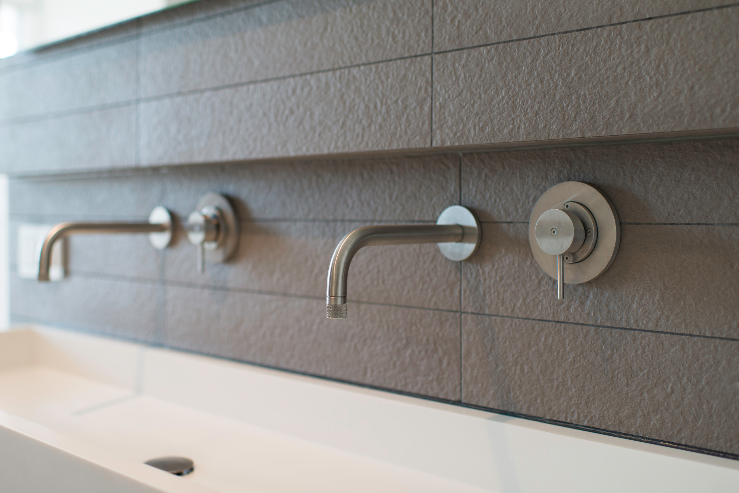 Die ebenfalls taupefarbenen Fliesen hinter dem Waschbecken setzen sich durch eine aufgeraute Oberfläche ab und wirken fast wie Mauerwerk.