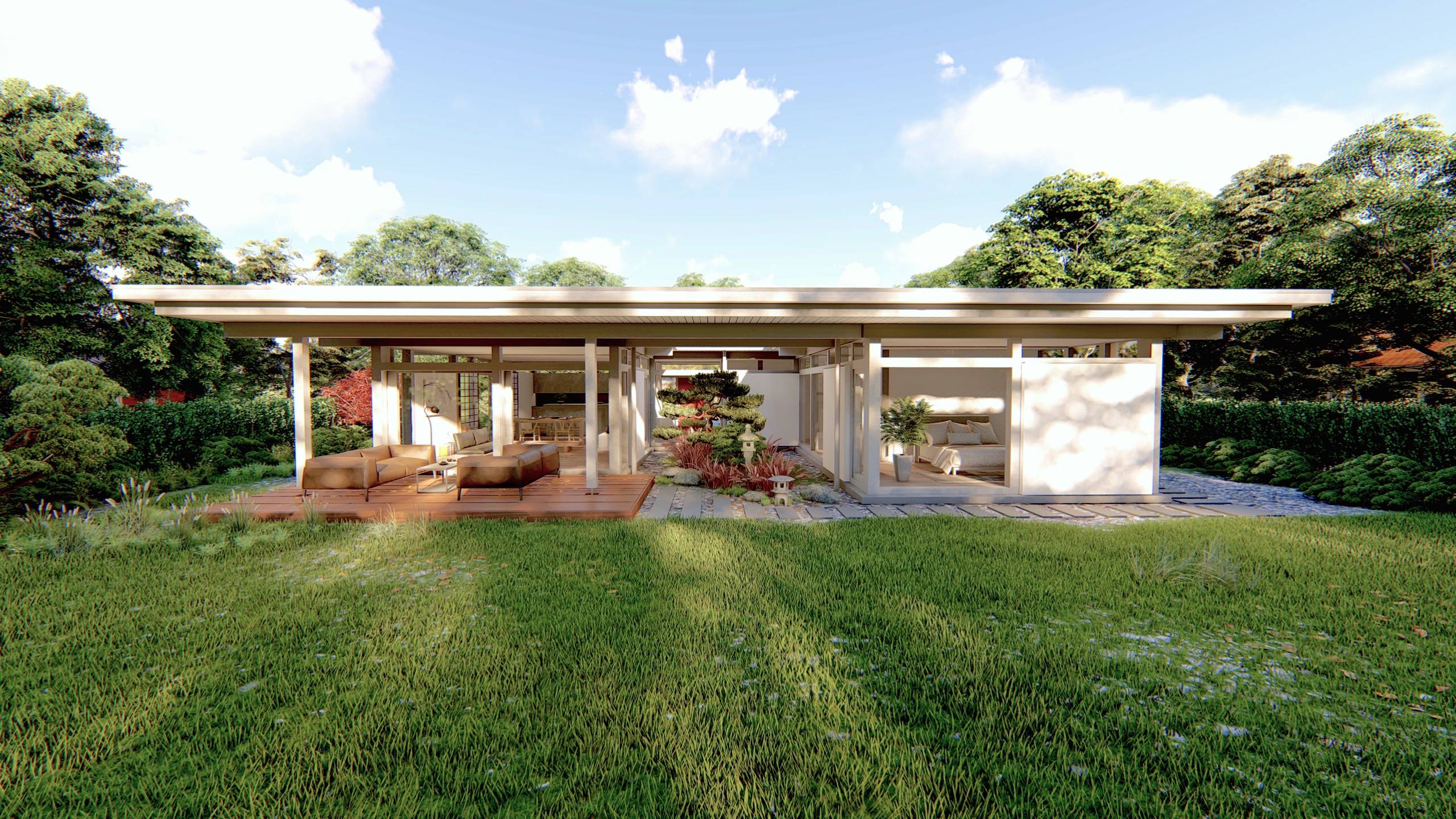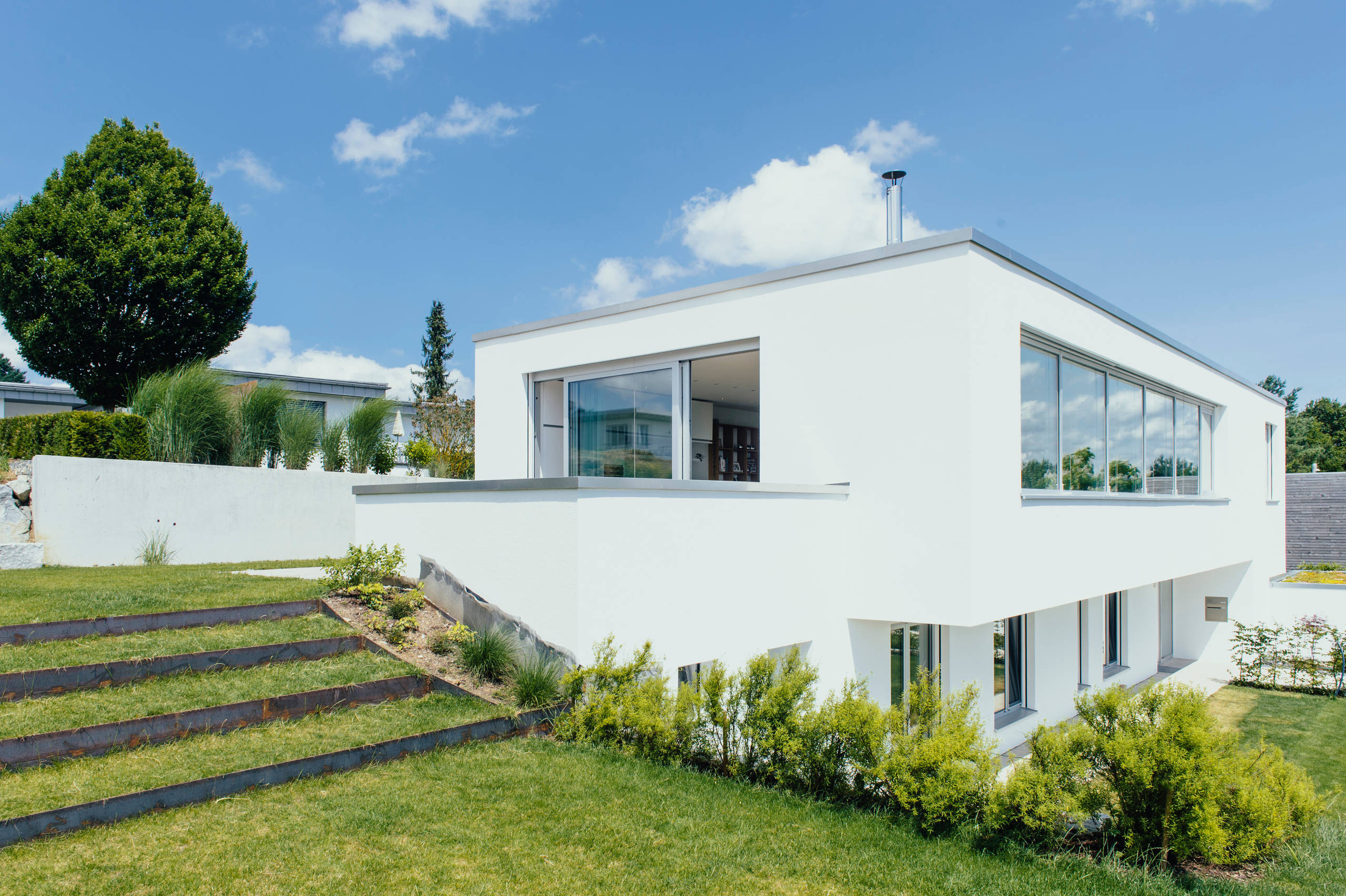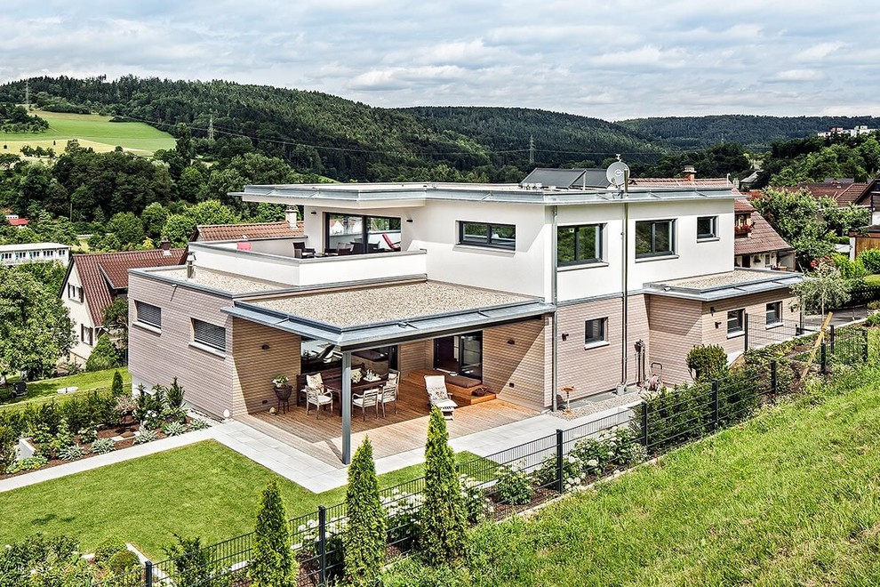 Im Bild: Ein Beilharz Haus mit schwebenden Flachdächern, die praktischerweise die Terrassen überdachen