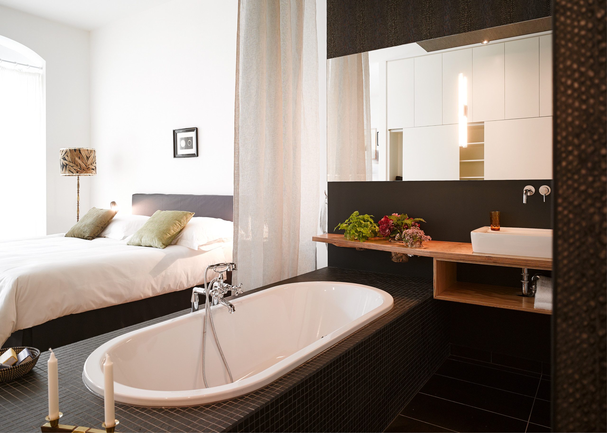 Ebenfalls in Berlin bediente sich Interior-Designerin Sandra Pauquet in den Berliner Gorki Apartments dem selben Prinzip: Ein leichter Vorhang trennt den Schlaf- vom Badezimmerbereich ab, die kontrastreichen Wandfarben unterstützen den Eindruck. Gleichzeitig hält er Wasserspritzer aus dem Nassbereich zurück und gewährt Privatsphäre beim Baden.