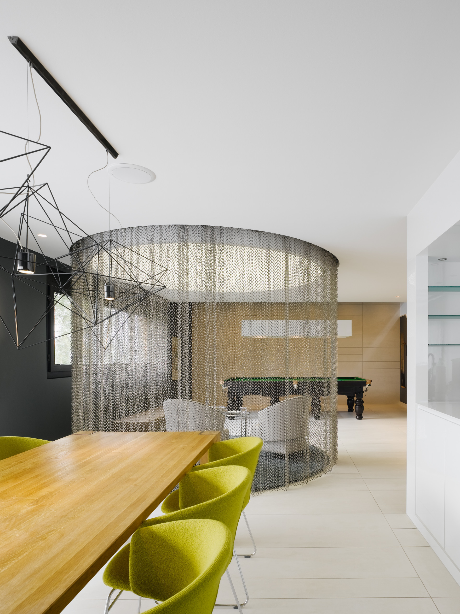 In diesem großzügig geschnittenen Raum treffen Küchen- und Essbereich sowie Sitzecke aufeinander. Um die Funktionsbereiche optisch voneinander zu trennen, fassten die Innenarchitekten von Ippolito Fleitz Group die Sitzinsel in einen zarten Metallvorhang ein. Sie wiederholten dabei die Kreisform von Oberlichtfenster und Teppich und hoben so die Sitzecke als Raumzentrum hervor.
