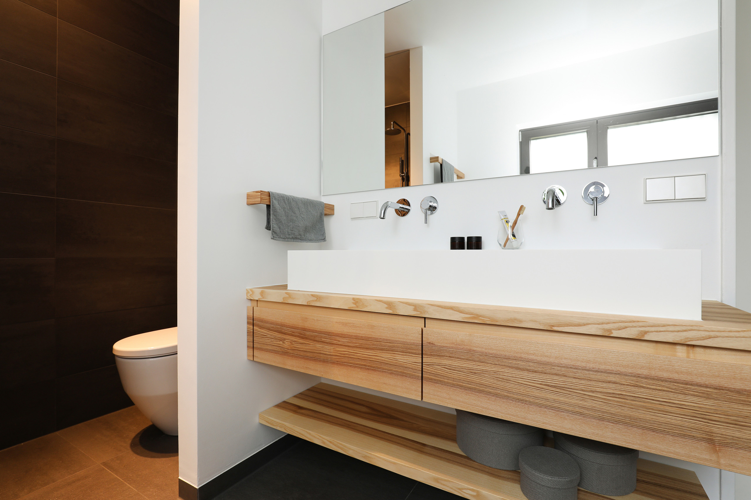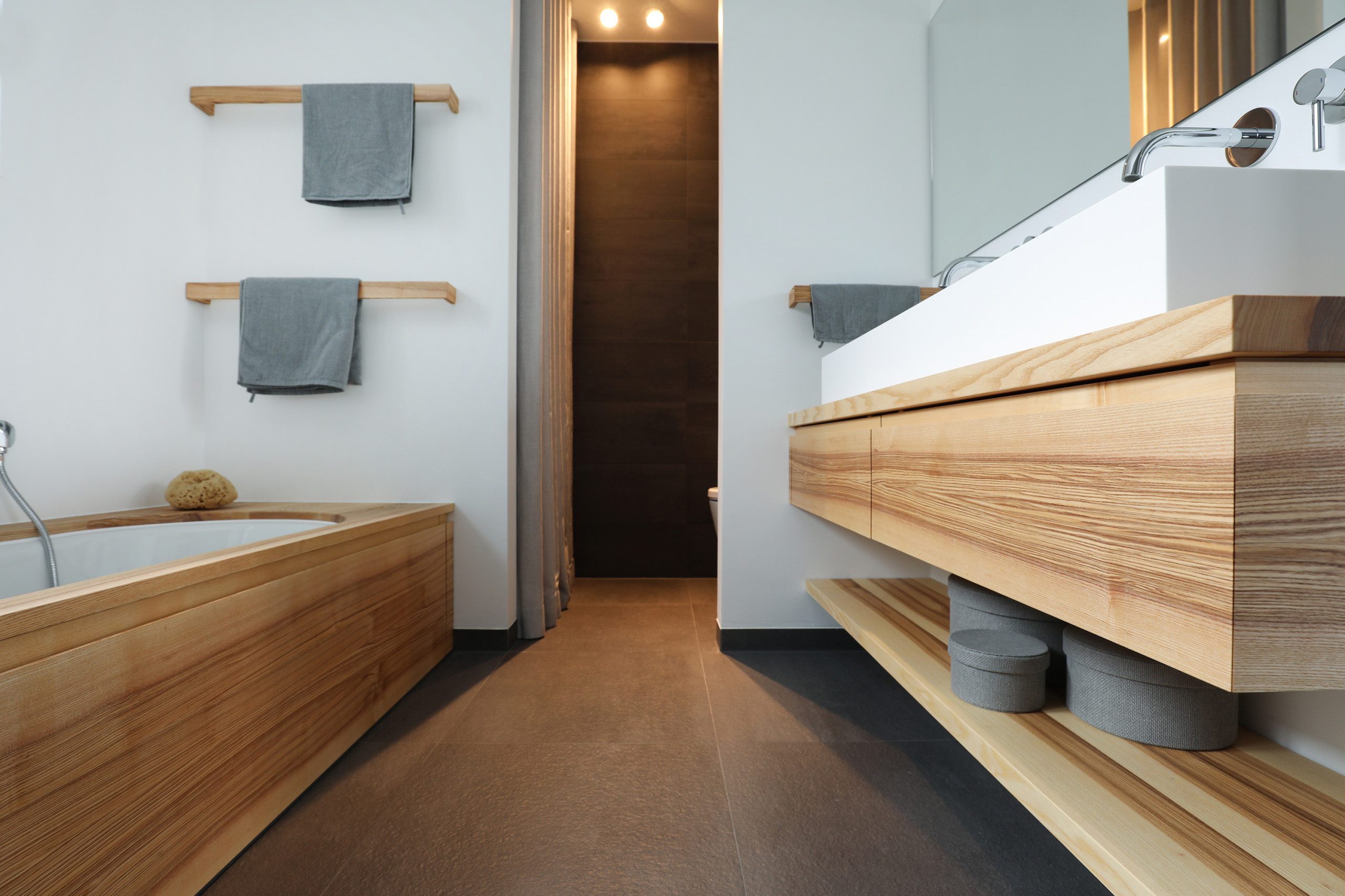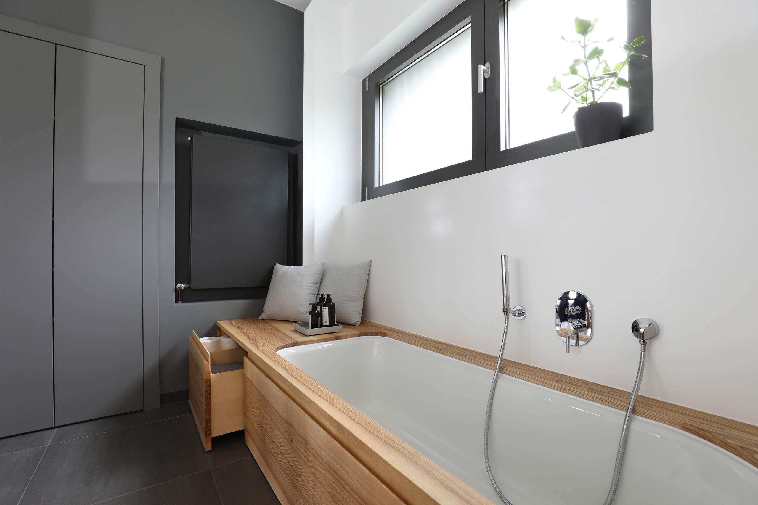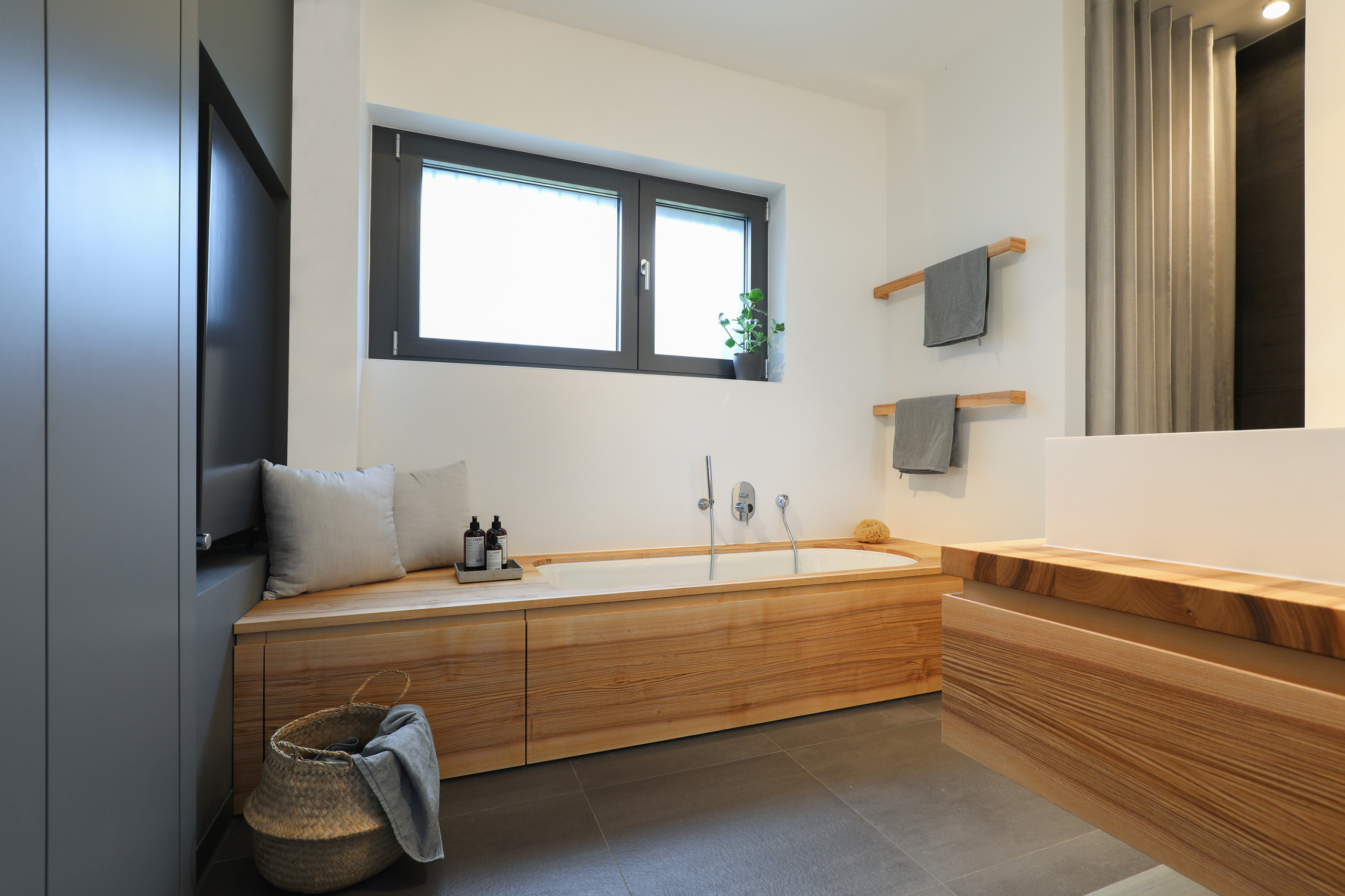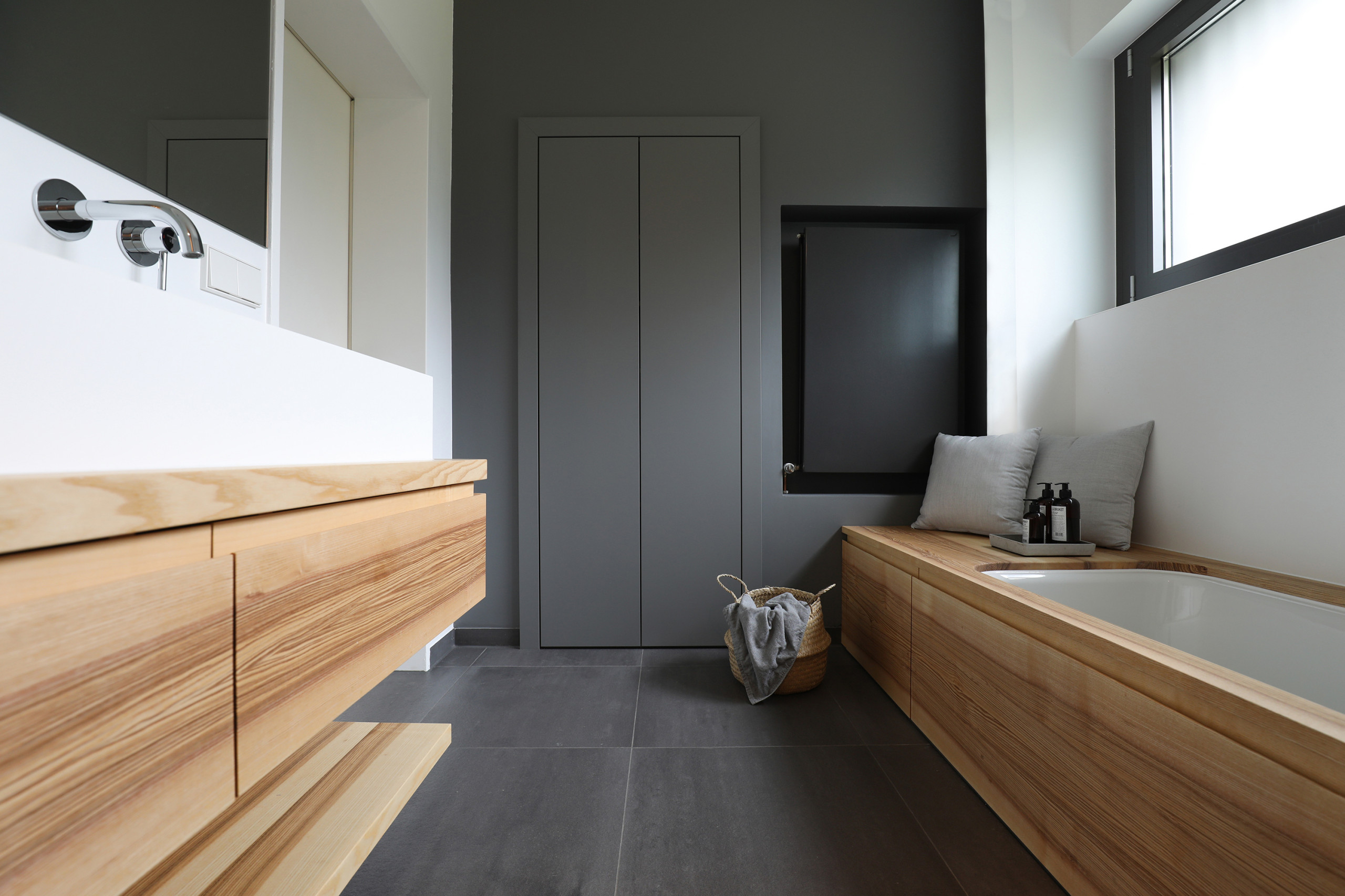 Die Familie wünschte sich ein Gestaltungskonzept in Anlehnung an den vorangegangenen Badezimmer-Umbau: „Der Raum sollte die bereits eingelöste, gute Atmosphäre wiederholen. Für eine einheitliche Form- und Materialsprache wurden, wie in dem 2017 fertiggestellten barrierefreien Bad, Kernesche und dunkelgraue Feinsteinfliesen verwendet. Die Planung einer Dusche und einer Badewanne waren insbesondere der Wunsch des Vaters“, erinnert sich Innenarchitektin Eva Lorey.
