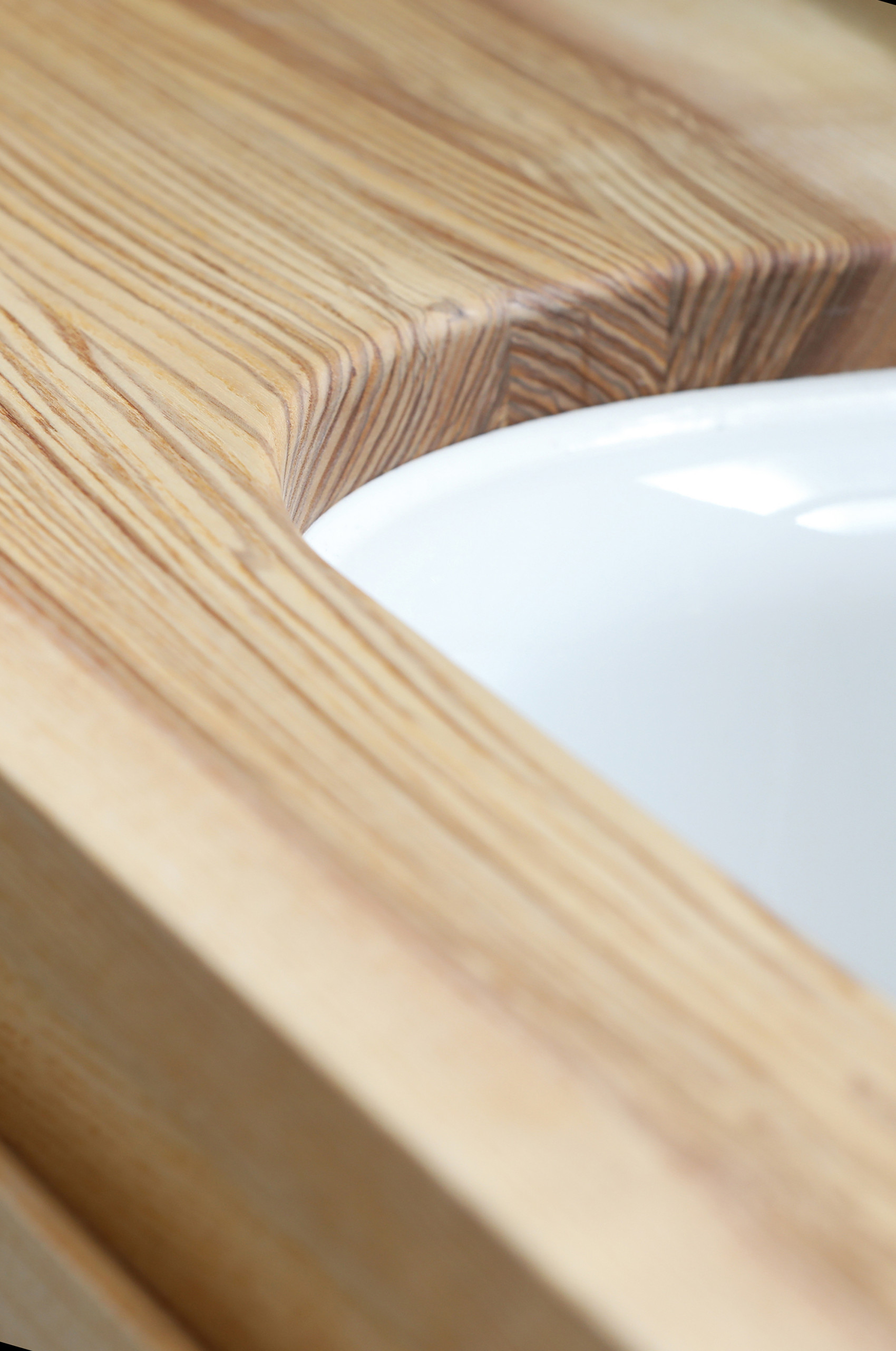 Die Badewanne wurde ebenfalls mit Kernesche verkleidet, sodass ein gemütliches Sitzpodest mit zusätzlichem Stauraum darunter entstand. Die Kissenhüllen sind aus demselben Stoff wie der Duschvorhang. Die Bewohner nutzen diese zusätzliche Sitzgelegenheit besonders gerne.