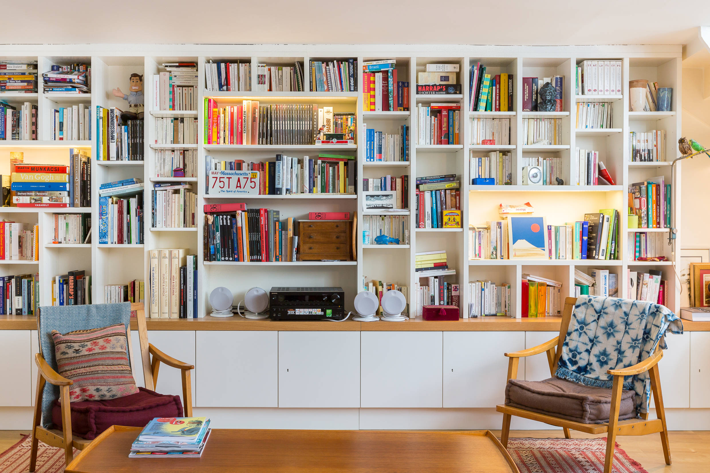 Das große Regal bietet zwei Besonderheiten: Zum einen verfügt es über drei große, beleuchtete Fächer, die mit den anderen Leuchten des Raums verbunden sind; zum anderen sind die Fächer im Mittelteil komplett variabel: „Die zwei unteren Böden lassen sich leicht herausnehmen. So ist zum Beispiel im Nu Platz für einen Fernseher“, erzählt Butin.