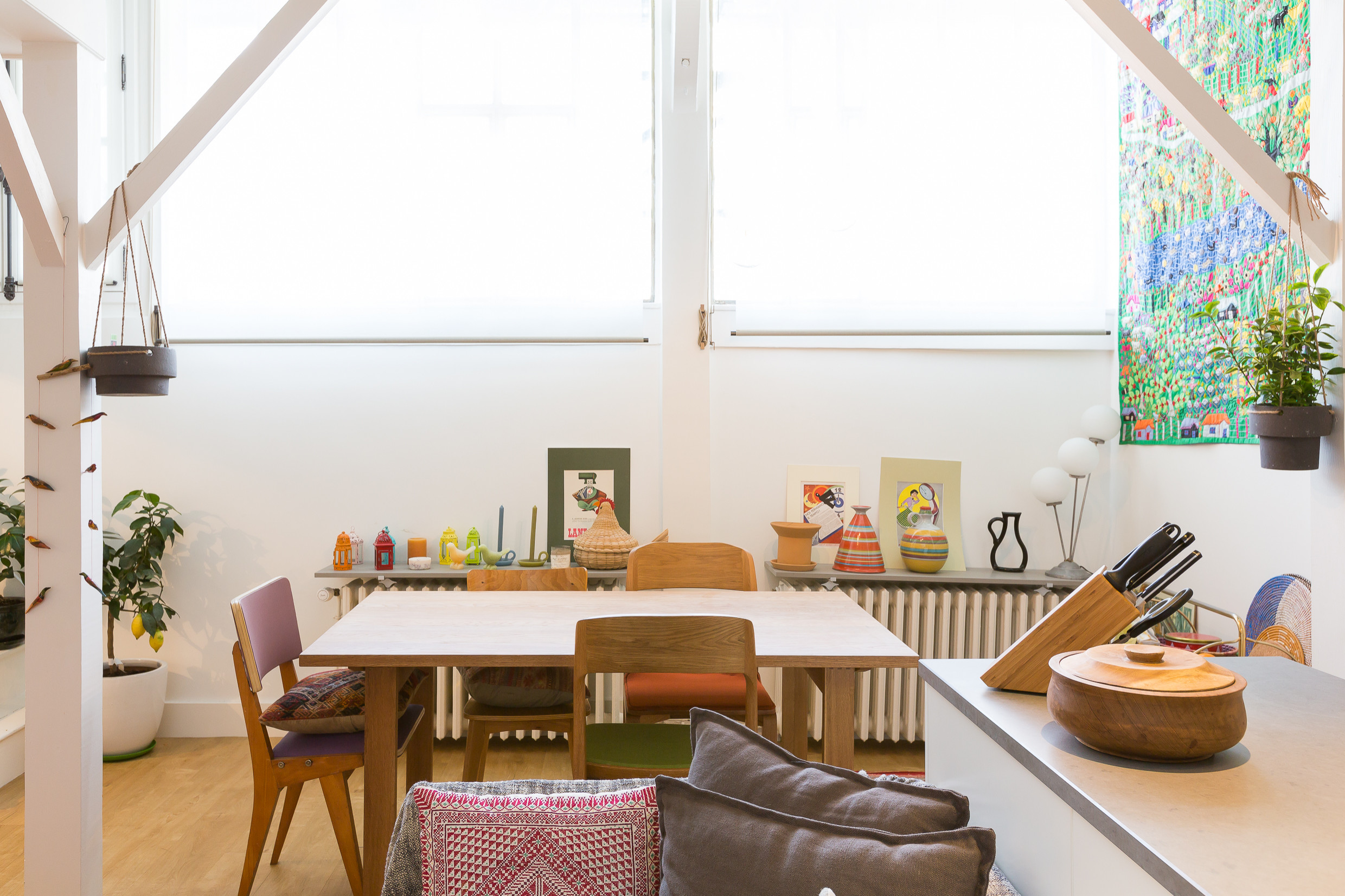 Damit der Bereich schön luftig und nicht überladen wirkt, ließ Butin die Wand unter dem Fenster weiß streichen. In Verbindung mit dem Holz schuf er so eine wunderbar entspannte Atmosphäre. Die Fenster sind mit Rollos ausgestattet, die einerseits als Sonnenschutz fungieren und andererseits der Einrichtung den letzten Schliff geben.