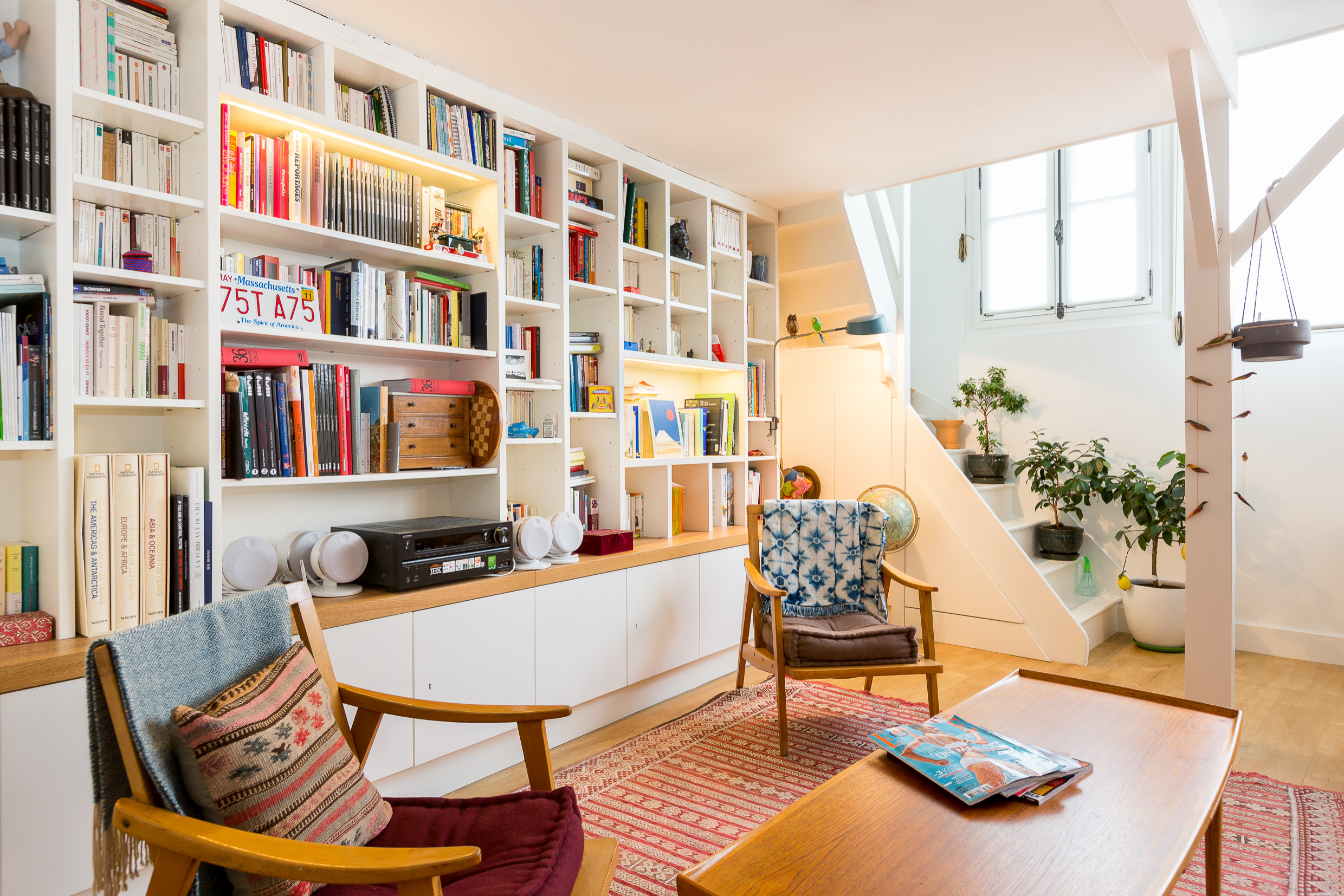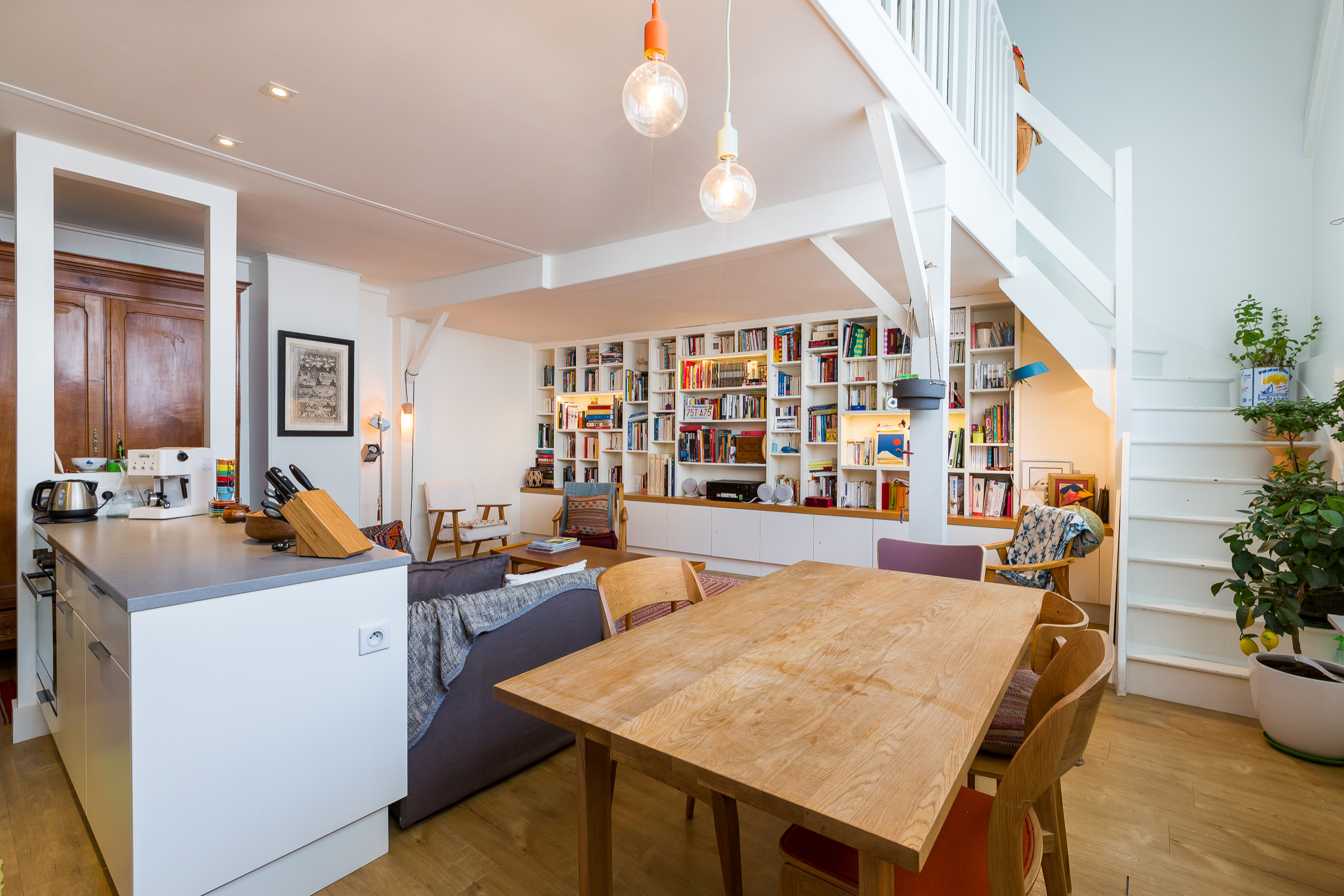 Was von außen unscheinbar aussieht, entpuppt sich von innen als Kleinod: „Der Loft-Charakter des Ateliers hatte es dem Paar sofort angetan. Der offene, helle Raum mit dem riesigen Fenster sowie das Mezzanin, das bis unters Dach reicht, ließen die Herzen der beiden höher schlagen“, erzählen Virginie Coste und Arnaud Butin vom Atelier Coste & Butin, die für den Umbau der Wohnung verantwortlich zeichneten. Nach jahrelangem Leerstand waren die Baumaßnahmen, die das Paar lieber Profis überließ, entsprechend umfangreich. Doch schon drei Monaten später war das Werk vollbracht und das praktische Zuhause einzugsbereit. Voilà!