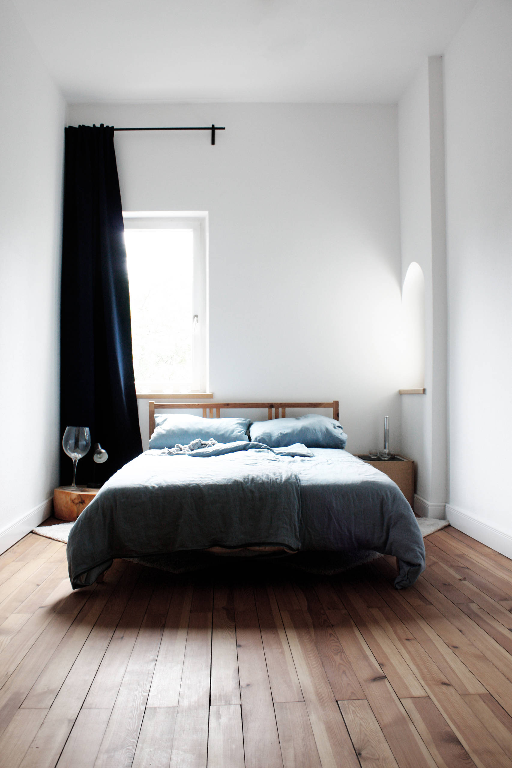 Eine große Holzflügeltür führt zum Schlafzimmer. Ein bisschen Männerbuden-Klischee gibt es hier schon: Ein schlichtes Doppelbett, eine Baumscheibe, die als Betttisch dient, und eine halbleere Kleiderstange genügen dem kreativen Minimalisten.