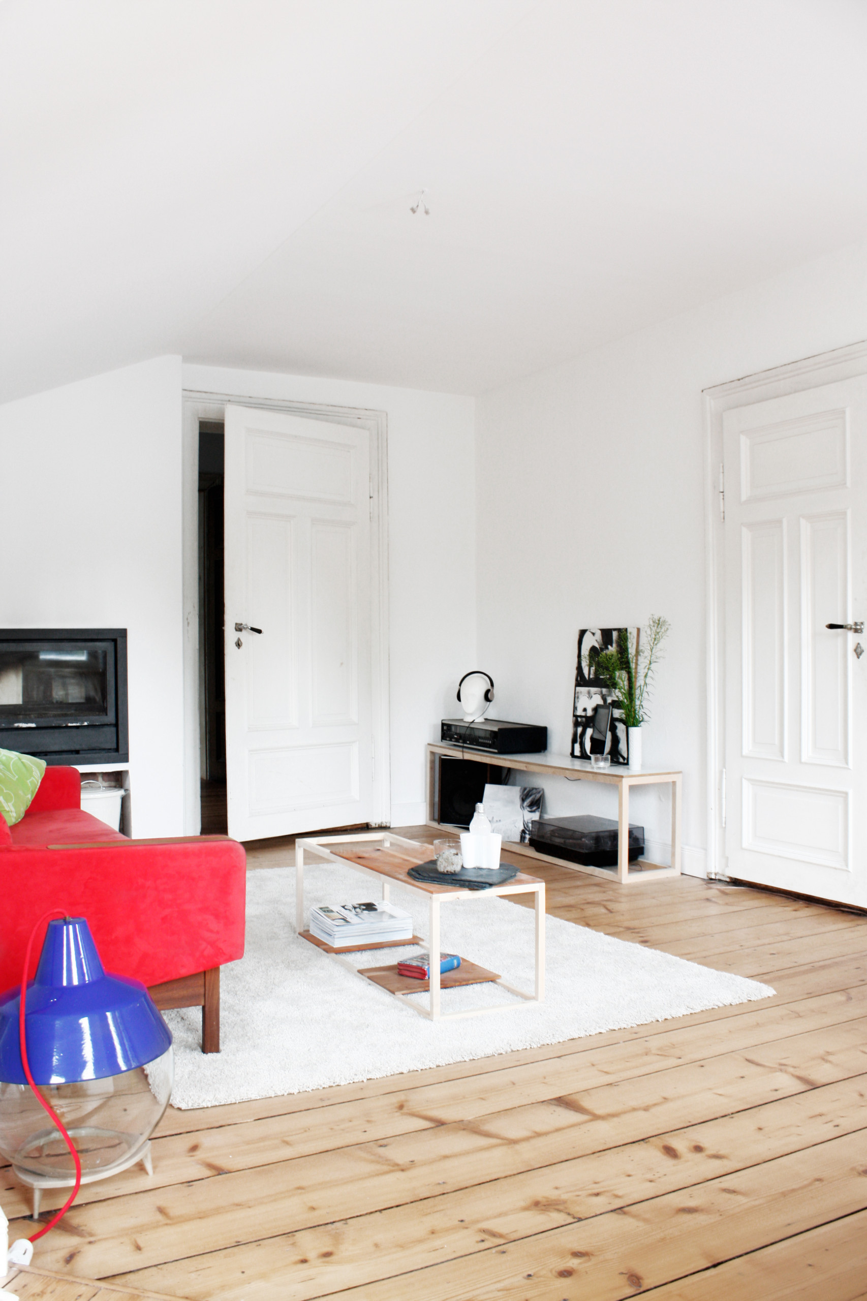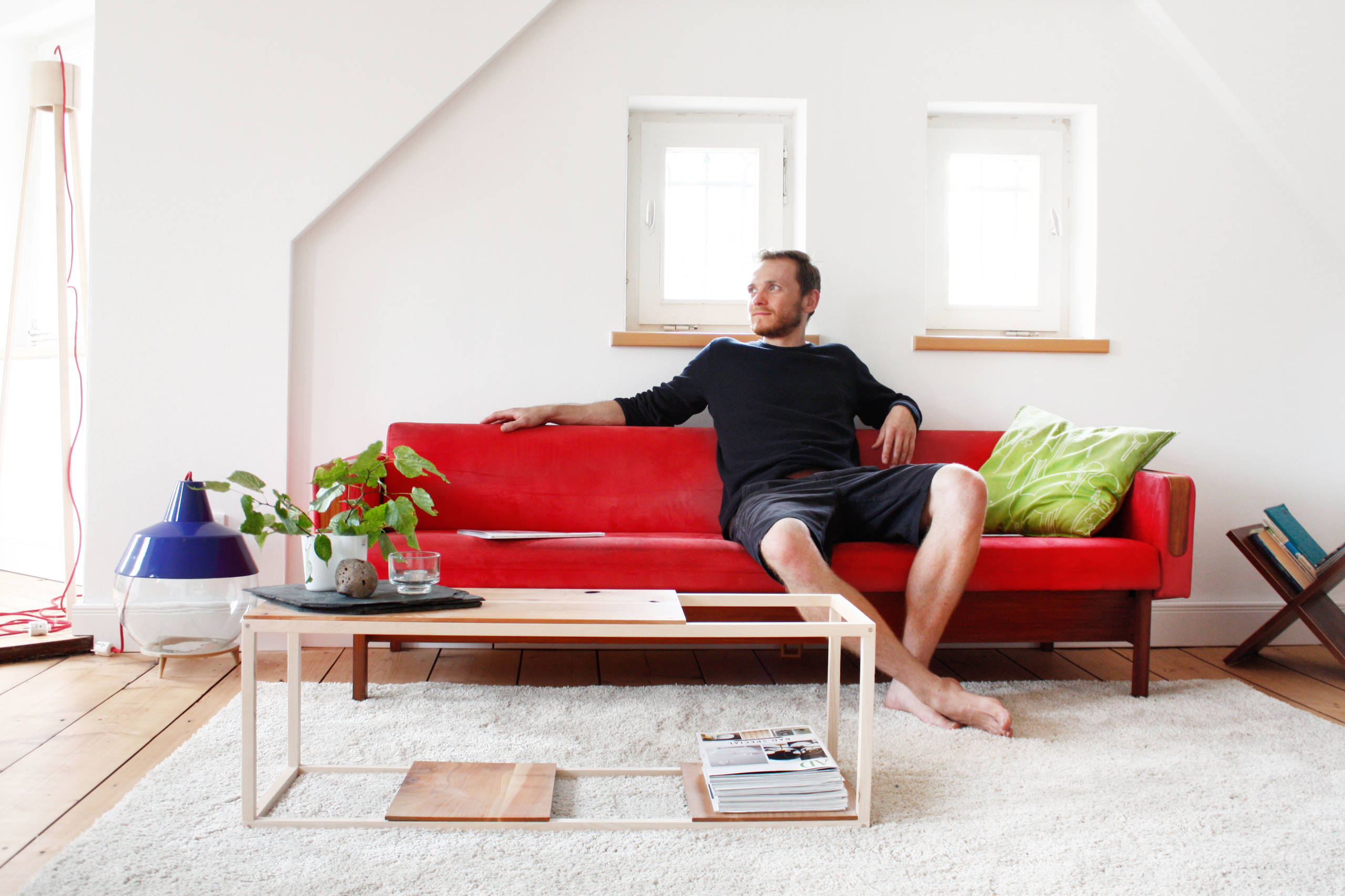So gelassen und lebensfroh wie sein Gemüt ist auch seine Wohnung: Neben eigenen Entwürfen trifft man überall auf spontane Möbelfunde – nicht anders im Wohnzimmer, das Dank des roten Mid-Century-Schlafsofas vom finnischen Produzenten OTKn Puu Osakayhtiö sprichwörtlich Feuer unterm Hintern hat. Vor dem peppigen Auktionsstück steht Königs Beistelltisch „Modular“. Das Möbel aus Kirsche und Ahorn zeigt sich minimalistisch verhalten, doch hält, was sein Name verspricht: Die Platten lassen sich flexibel austauschen – je nach Platzbedarf und Dekorationsvorlieben. Der Zeitungsständer neben der tiefen Couch ist übrigens ein Überbleibsel eines Auftragsentwurfs namens „Regalquadrat“; die blaue Kugellampe eine Eigenkreation von König, aus einer Industrieleuchte und dem altem Goldfischaquarium seiner Großmutter.