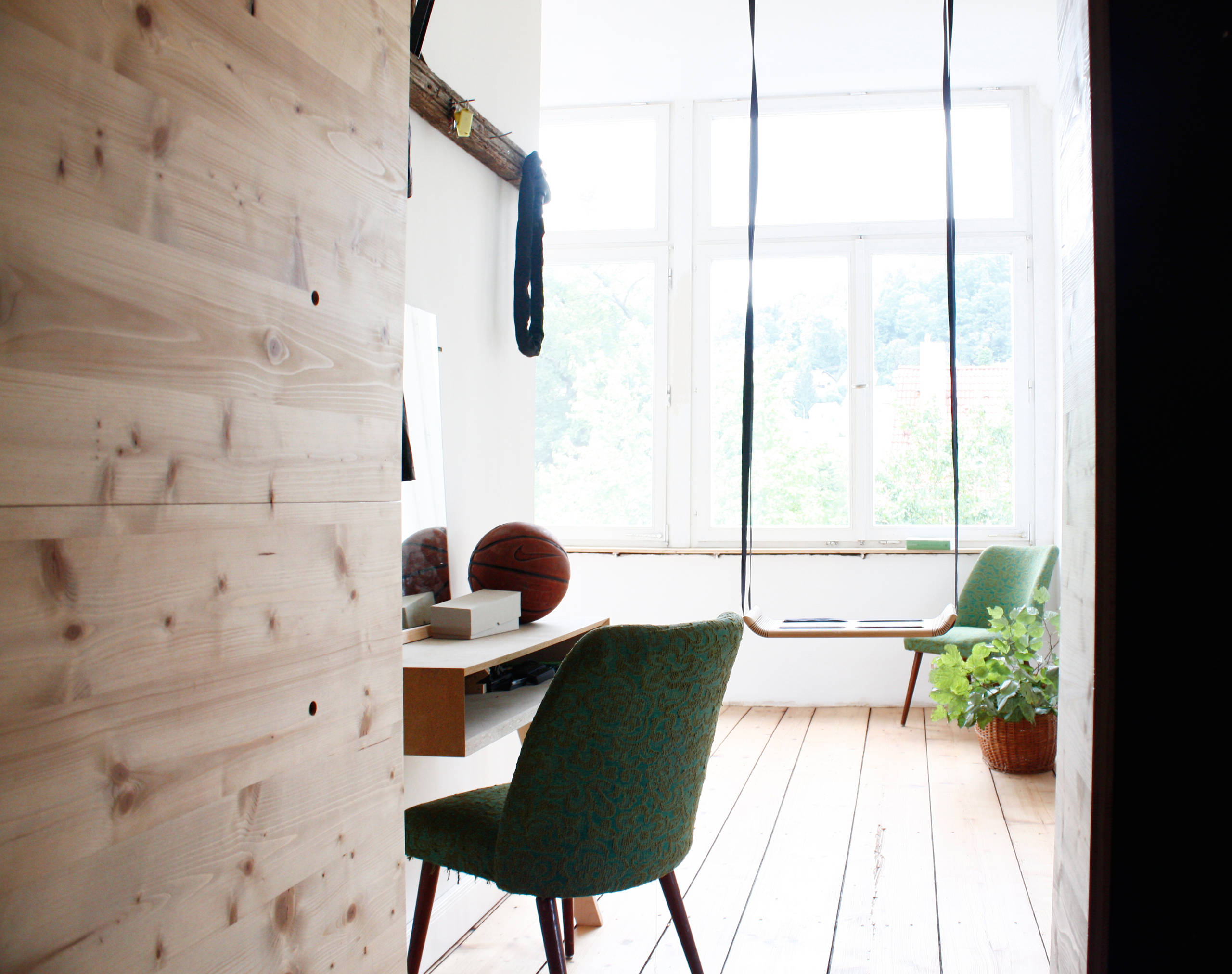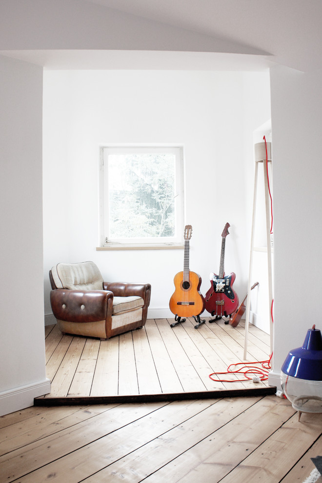 Den hinteren Teil des Wohnzimmers, das Turmzimmer, erklärte König zur Musikecke. Der Sessel, ein Straßenfund, erinnert zusammen mit seiner kleinen Gitarrensammlung an Proberäume, in denen die größten Rockstars einst ihre steile Karriere begannen. Manuel König startet aber lieber im Möbelbusiness raketenstark durch – mitsamt seiner weißen Stehlampe „Rocket“ mit rotem Textilkabel.