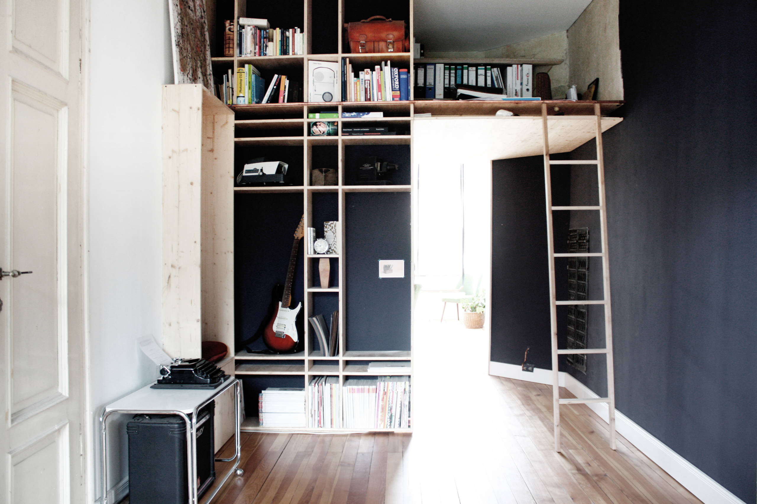 Auf der gegenüberliegenden Seite des Arbeitszimmers baute der Designer eine Komposition aus Sitzkubus und Regalsystem ein. Was als moderne Hausmediathek fungiert, hat in seinem Ursprung energetische Gründe. „Der integrierte Zwischenboden soll Wärme von Kamin und Sonneneinstrahlung, die sich zuvor in Deckenhöhe angestaut hat, weiterleiten“, so König.