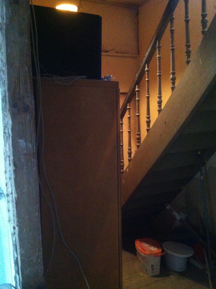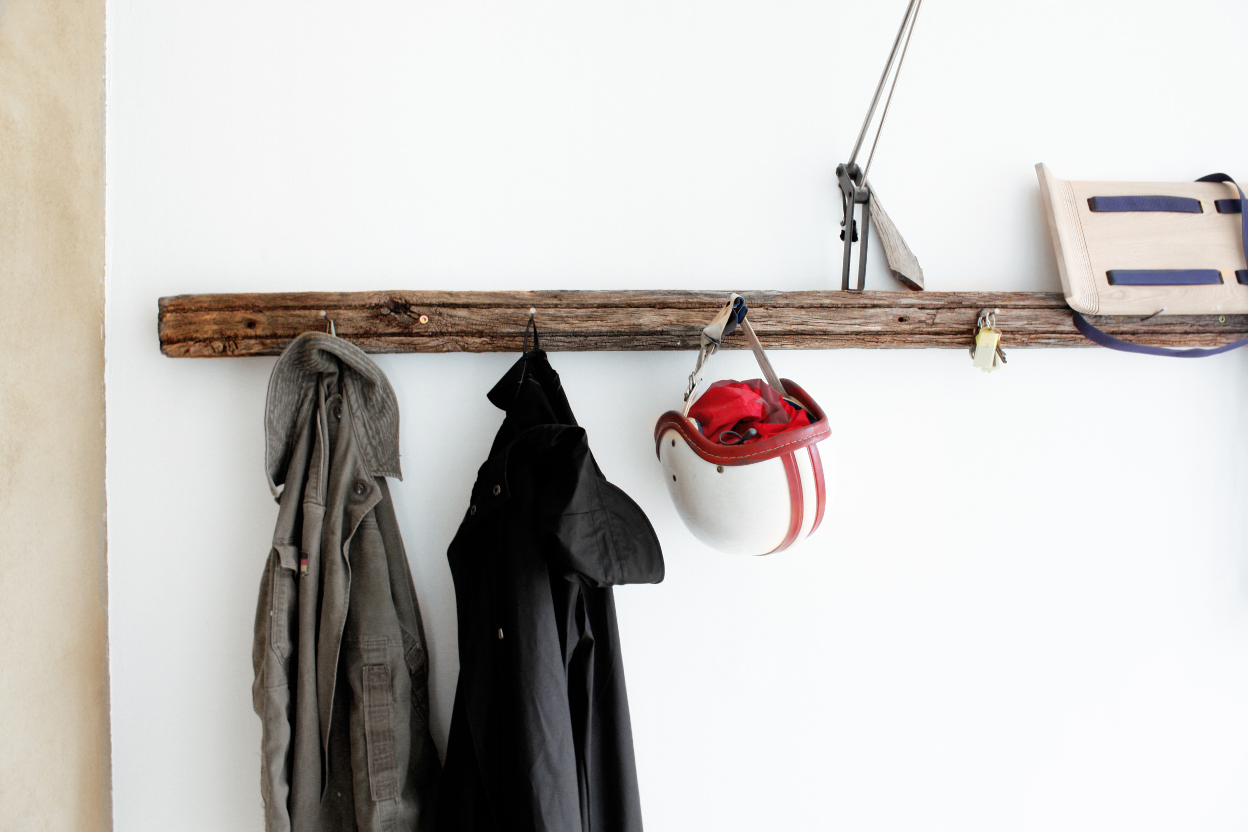 Gleich um die Ecke befindet sich eine ganz besondere Garderobe. Was wie ein heruntergekommenes Brett aussieht, ist eine Bohle aus Gustav Langes „Treppe ins Nichts“ für die Documenta IX (1992). Diese wurde im Jahr 2000 in einer Nacht-und-Nebel-Aktion abgerissen. König (der unter anderem an der Werkakademie für Gestaltung Hessen, Kassel lernte) bekam irgendwann eine Bohle geschenkt und machte eine Garderobenleiste daraus.