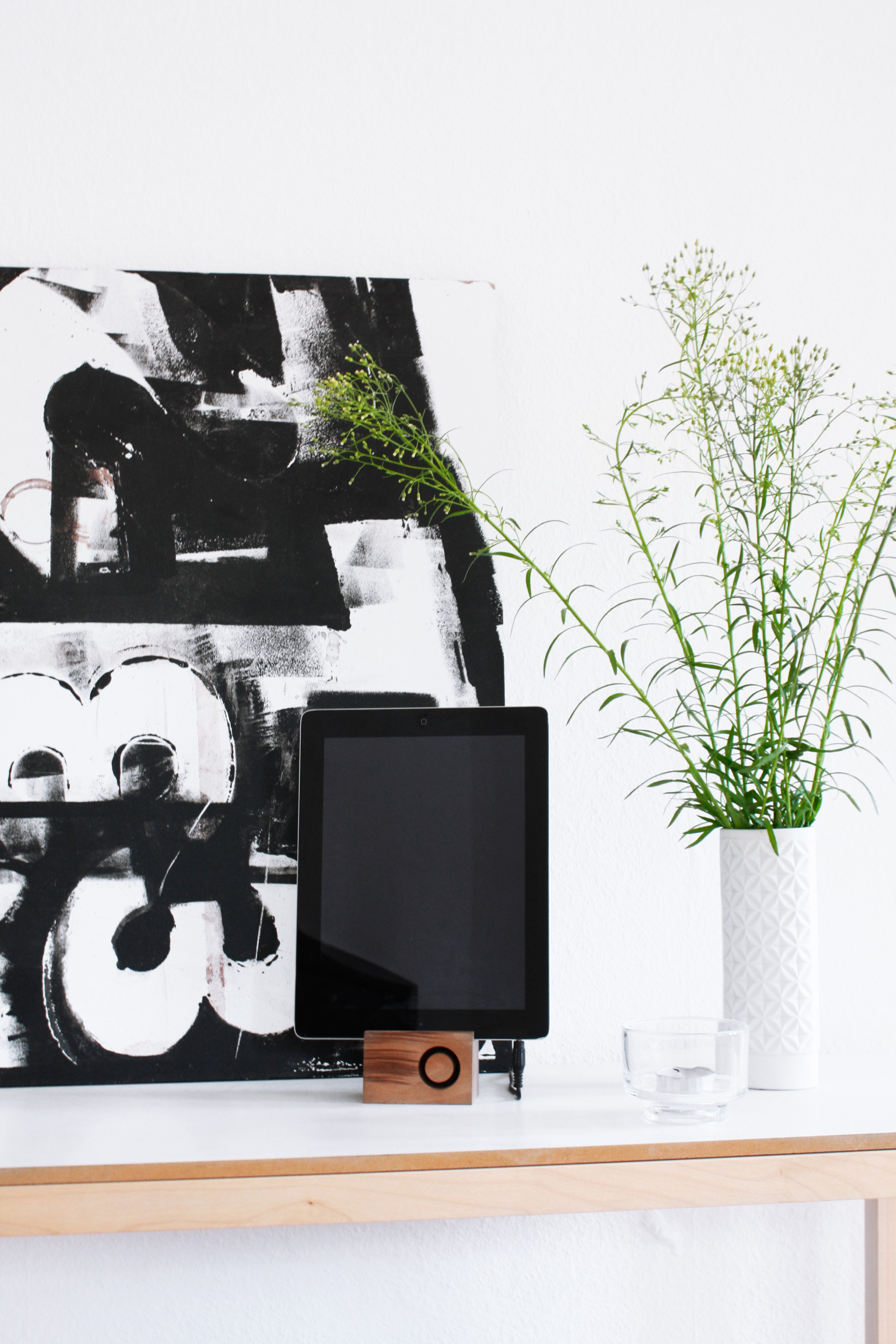 Ein Konzept bei der Gesamteinrichtung gab es vorher nicht. Trotzdem trifft König mit seinem intuitiven Ästhetikgespür ins Schwarze. Wie bei diesem Arrangement aus Streetart-Bild (einer überraschend schönen Lackierunterlage von einem Podestbau), der Vase aus Biskuitporzellan (wieder ein Fundstück) mit Gräsern aus dem Vorgarten und einem selbst entworfenen Tablett/Smartphone-Ständer (den König auch verkauft).