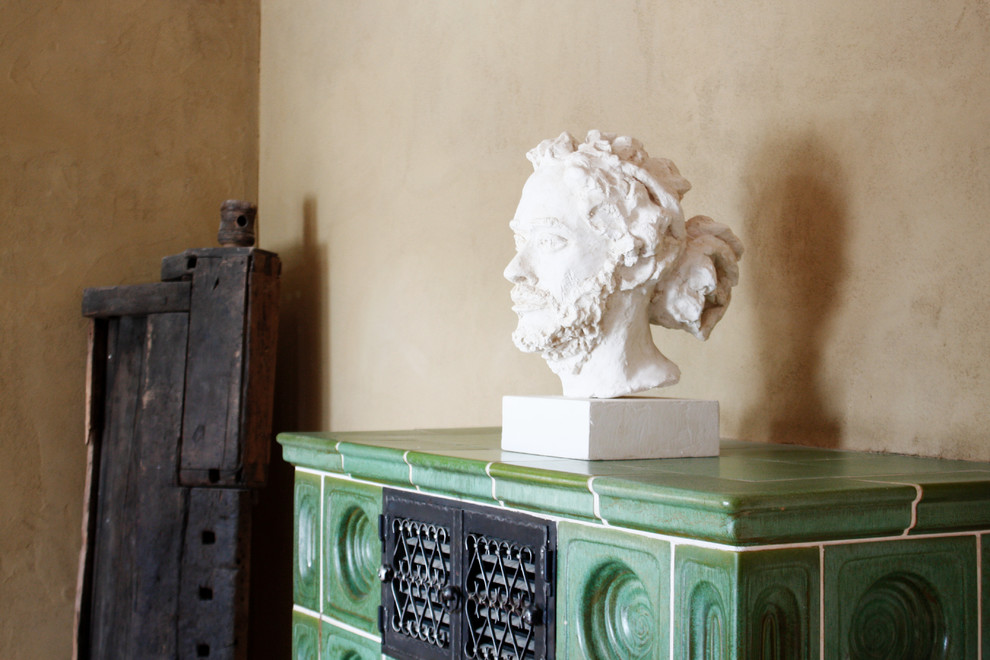 Was auf dem Kachelofen thront, ist nicht einfach nur irgendeine Büste, während seines Studiums modellierte König den Kopf eines befreundeten Buchbinders und Kommilitonen. Die ausdrucksstarken Strukturen von Bart und Haar korrespondieren – wie auch die Blickrichtung – mit der Hängelampe, ein Souvenir von Königs Schwester aus Italien.