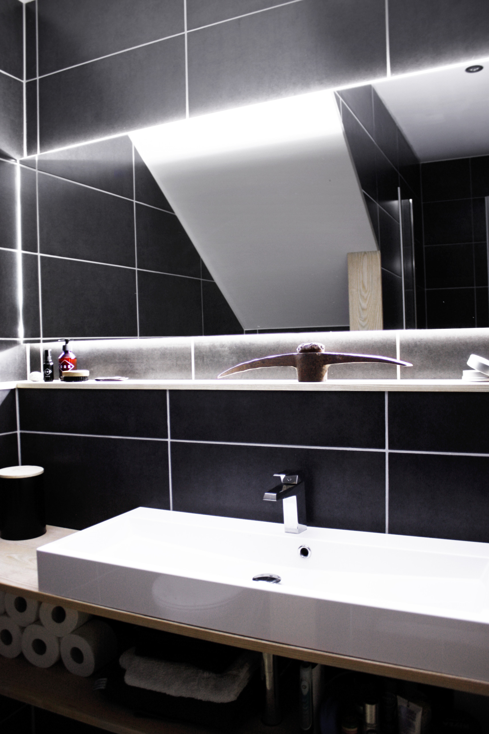 NACHHER: Das neue Badezimmer, das direkt an das Schlafzimmer angeschlossen ist, flieste König selbst – unter Regie seines Großvaters. „Ich wollte mit der Fliesenwahl starke Kontraste zu den weißen Badmöbeln sowie dem Bodenbelag und den Ablageflächen aus Esche schaffen“, sagt König. Das langfasrige Holz ist übrigens das Lieblingsmaterial des Designers: „Vielfältig in Textur und Farbspktrum. Stabil, aber zugleich sehr elegant“, schwärmt er.